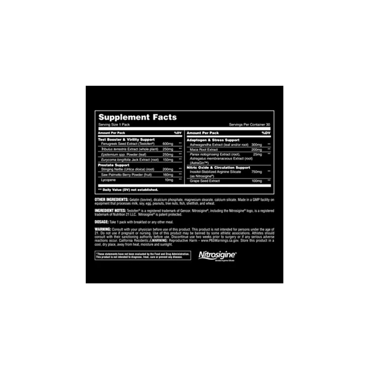 Includes trademarked, research-backed ingredients: Testofen® and Nitrosigine®.