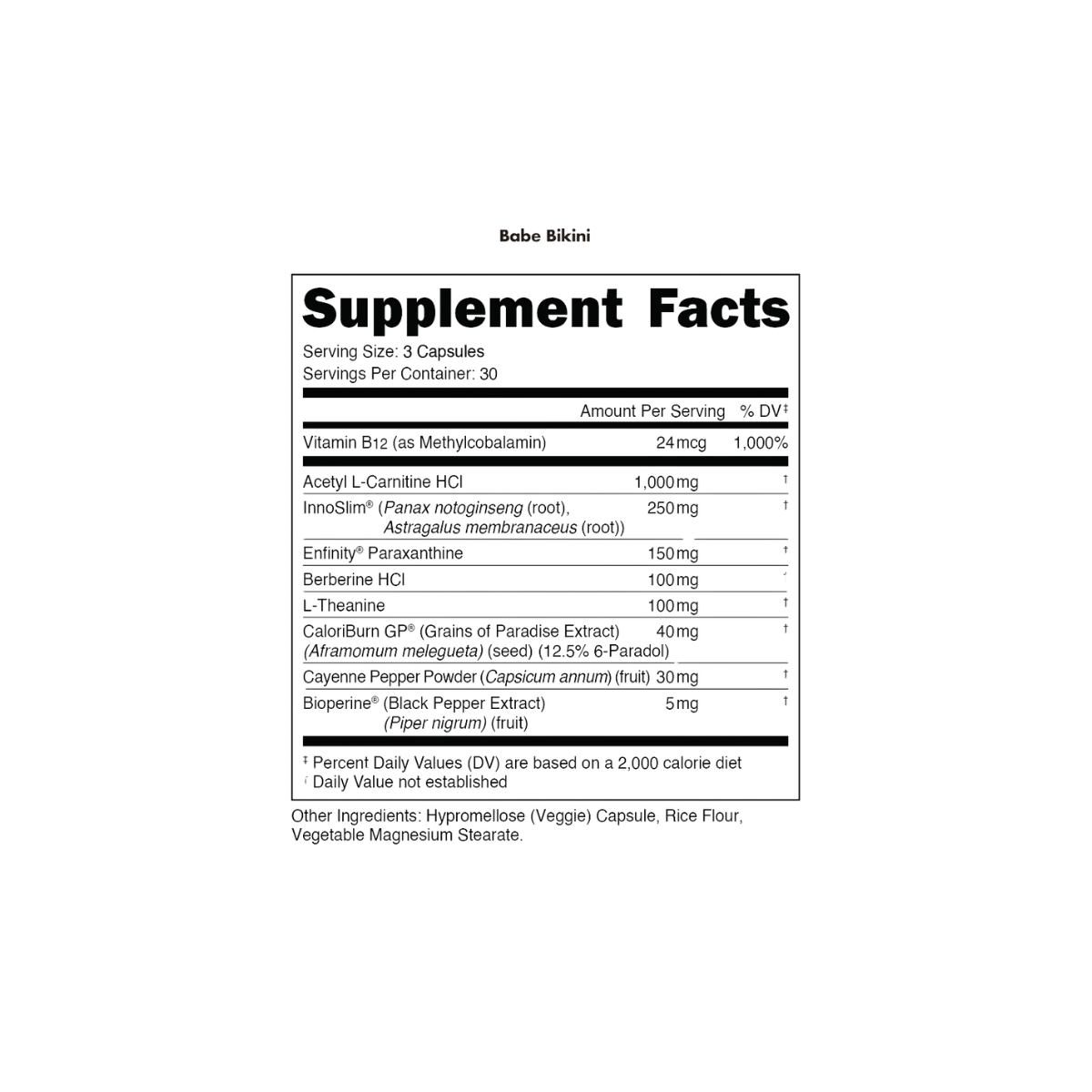 BUCKED UP® Babe Bikini™ is a cutting-edge thermogenic formula designed for women seeking a powerful edge in their fat-burning journey. Packed with premium, scientifically backed ingredients like 1,000mg of Acetyl L-Carnitine HCl, 250mg of InnoSlim®, 150mg of enfinity® Paraxanthine, and 40mg of Caloriburn GP®, this innovative blend ignites metabolism, supports increased energy expenditure, and enhances mental clarity—all without the jitters of traditional caffeine. With additional support from L-Theanine, Bioperine®, Berberine HCl, and Cayenne Pepper Powder, BABE BIKINI™ is clinically formulated to amplify fat loss, elevate focus, and support overall well-being when combined with exercise.