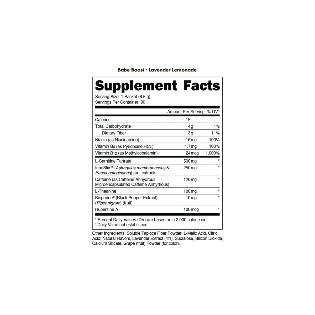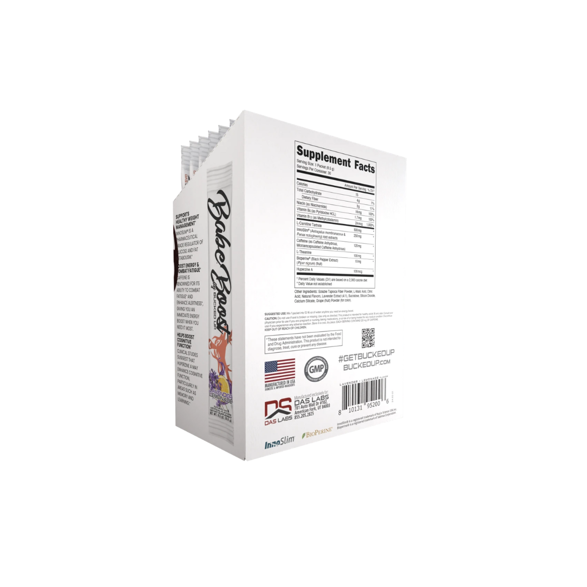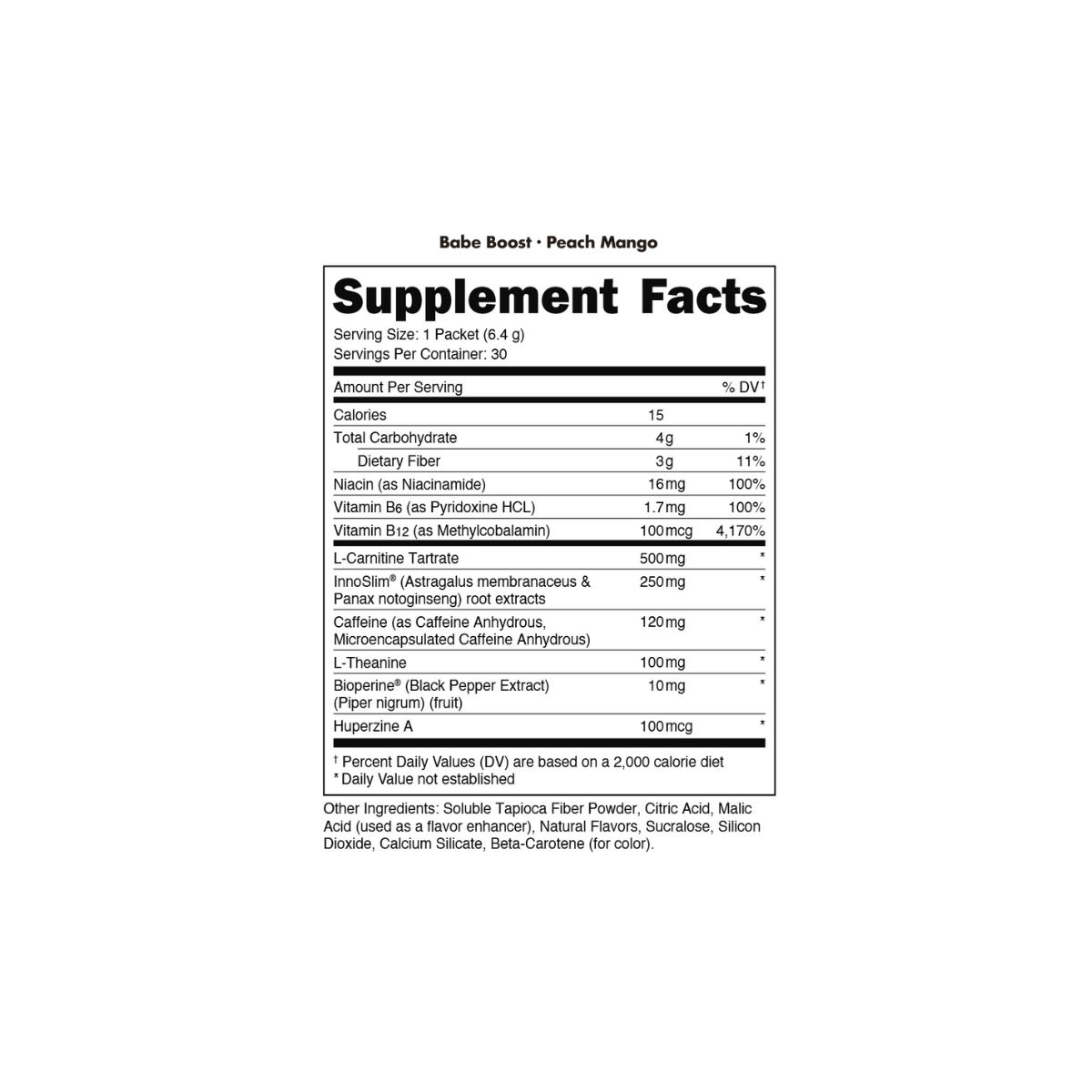 BUCKED UP® Babe Boost™ is the delicious, no-crash energy solution designed to keep up with your busy lifestyle. Whether you’re powering through a workout, commanding the boardroom, or conquering the chaos of daily life, BABE BOOST™ delivers clean, focused energy with 120mg of caffeine, synergized with 100mg of L-theanine to smooth the edges and help keep you calm yet alert. Enhanced with 500mg of L-Carnitine Tartrate for fat metabolism and endurance, 250mg of InnoSlim® to support body composition and appetite control, plus Huperzine A, Niacin, and BioPerine® for peak cognitive and nutrient performance, this formula is your go-to ally for all-day momentum—without the jitters or crash.