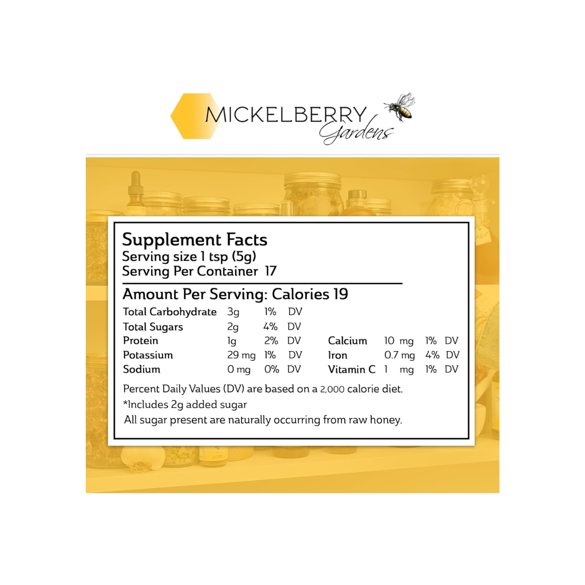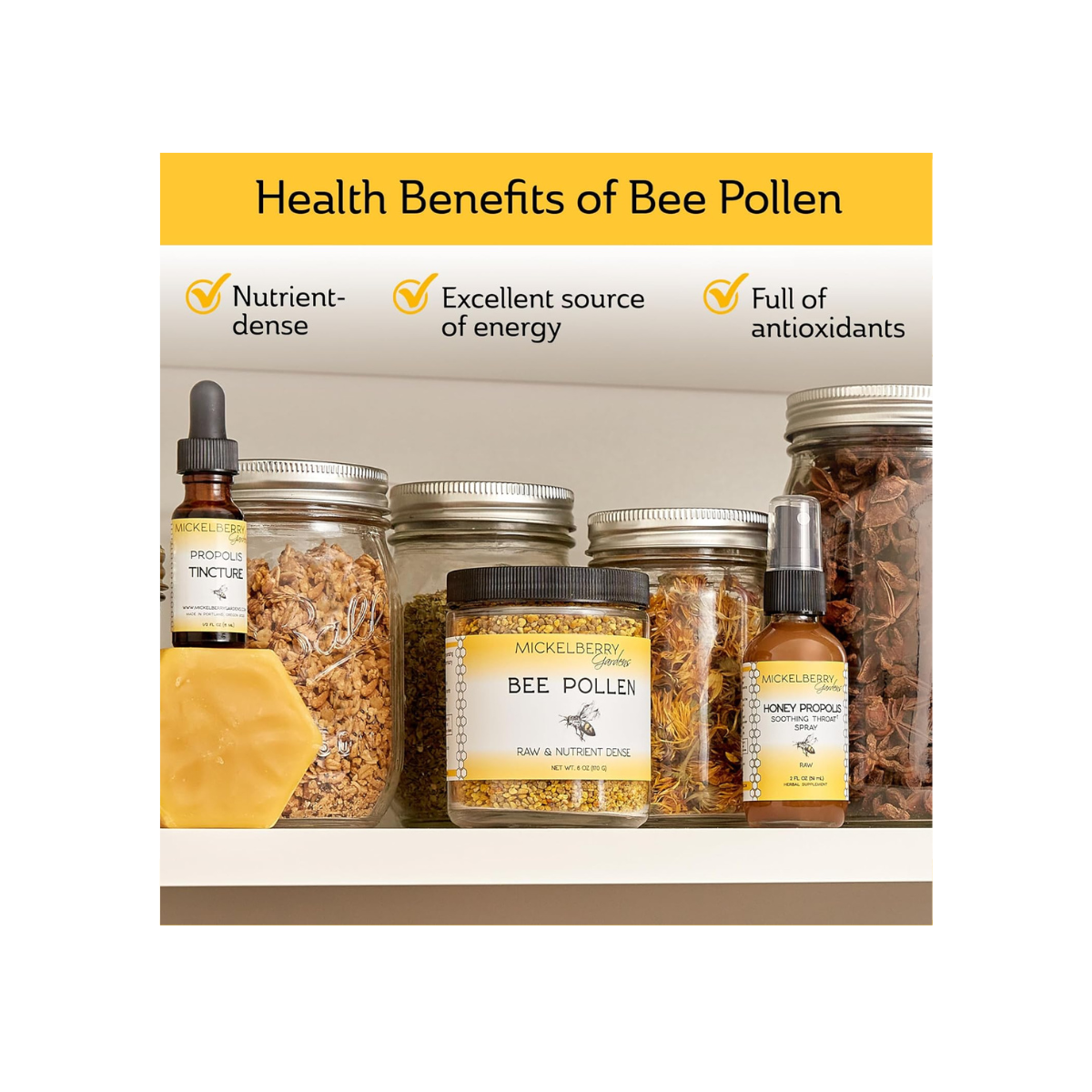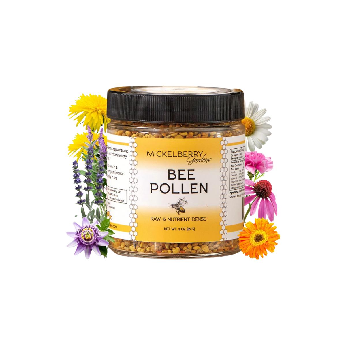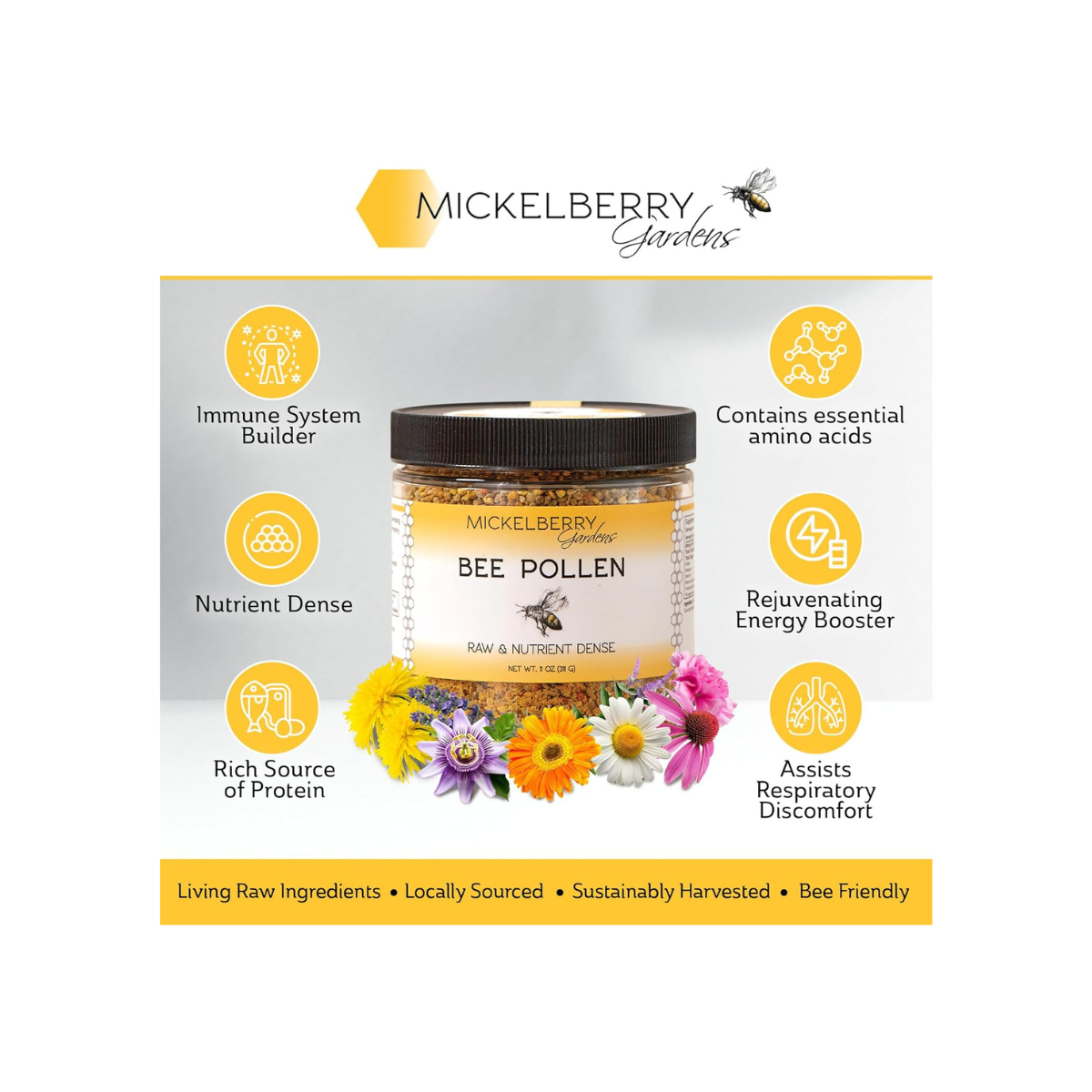 MICKELBERRY GARDENS™ Pacific Northwest Bee Pollen is a naturally powerful superfood harvested from a diverse array of wildflowers throughout the seasons. Sustainably collected with the health of the bees in mind, this nutrient-rich pollen is packed with complete proteins, essential amino acids, vitamins, minerals, and antioxidants—making it an exceptional natural energy source. With its sweet, floral taste and vibrant color variation, bee pollen may also support seasonal respiratory comfort and overall vitality. Enjoy it straight from the jar or as a flavorful boost to smoothies, salads, yogurt, or granola.