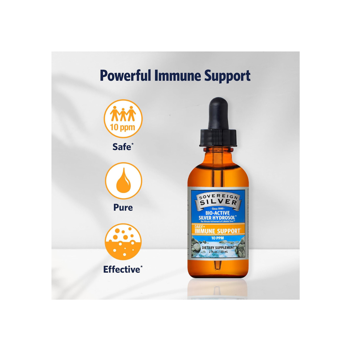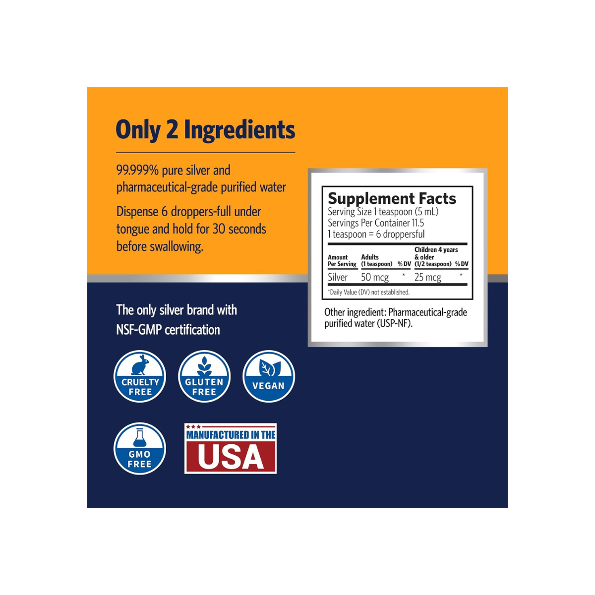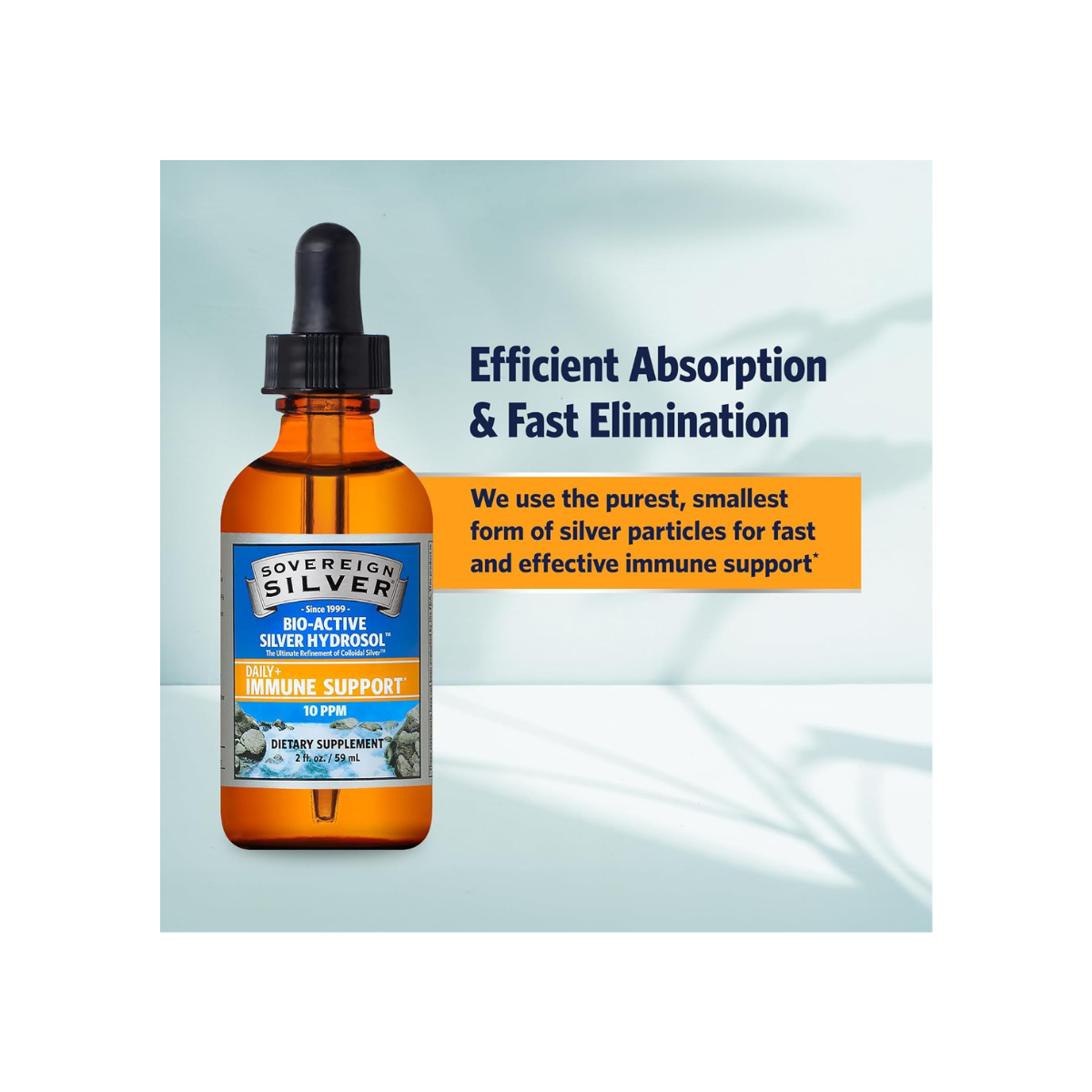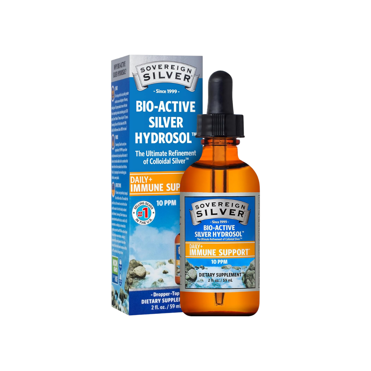 SOVEREIGN SILVER® Bio-Active Silver Hydrosol - Dropper-Top is a premium immune support formula crafted for those who demand purity, potency, and proven effectiveness. Made with only 99.999% pure silver and pharmaceutical-grade purified water, this hydrosol features a low yet powerful 10 ppm concentration and utilizes ultra-small silver particles—as small as 0.8 nanometers—for superior absorption and bioavailability. Positively charged and bio-active, these microscopic particles are designed to support your immune system when you need it most, making it safe† and effective* for the whole family—up to 7x daily. Free of GMOs, gluten, and allergens, it’s your daily dose of health sovereignty in every drop.