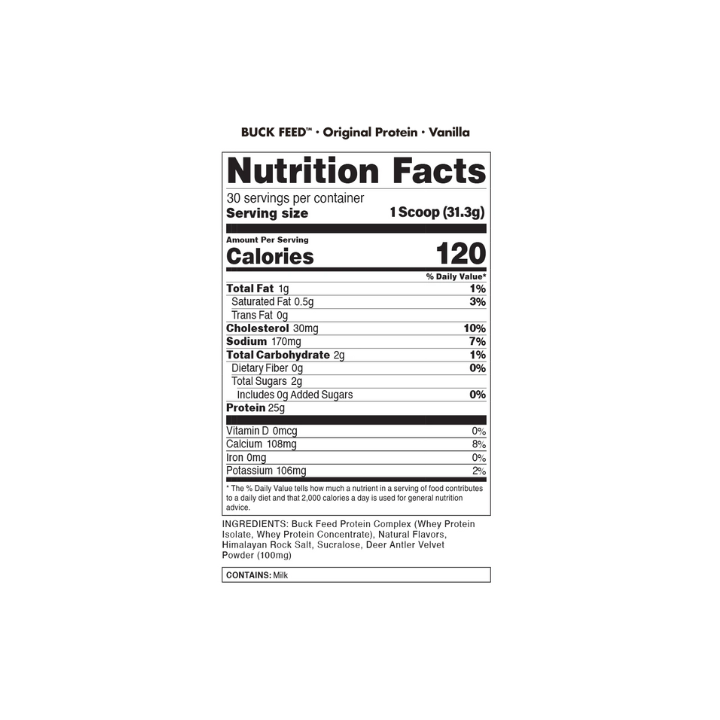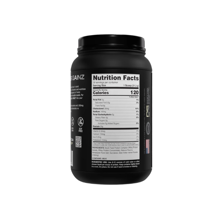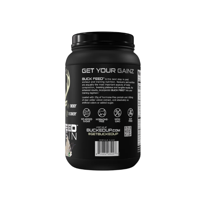 BUCKED UP® Buck Feed Original delivers 25g of hormone-free whey protein, plus Deer Antler Velvet (excluding Snickerdoodle and Cake Pop flavors) to support muscle growth, recovery, and fat loss when combined with exercise.* Designed for those who demand quality, this low-carb, soy-free formula fuels your fitness journey without compromise.
