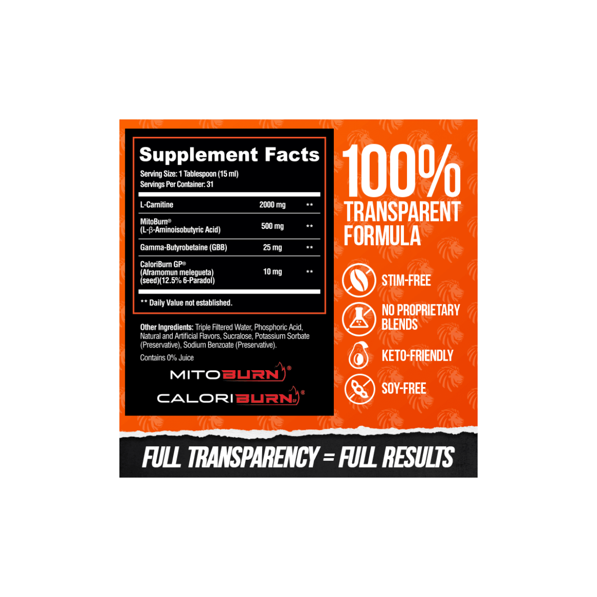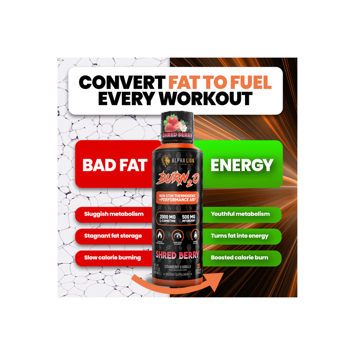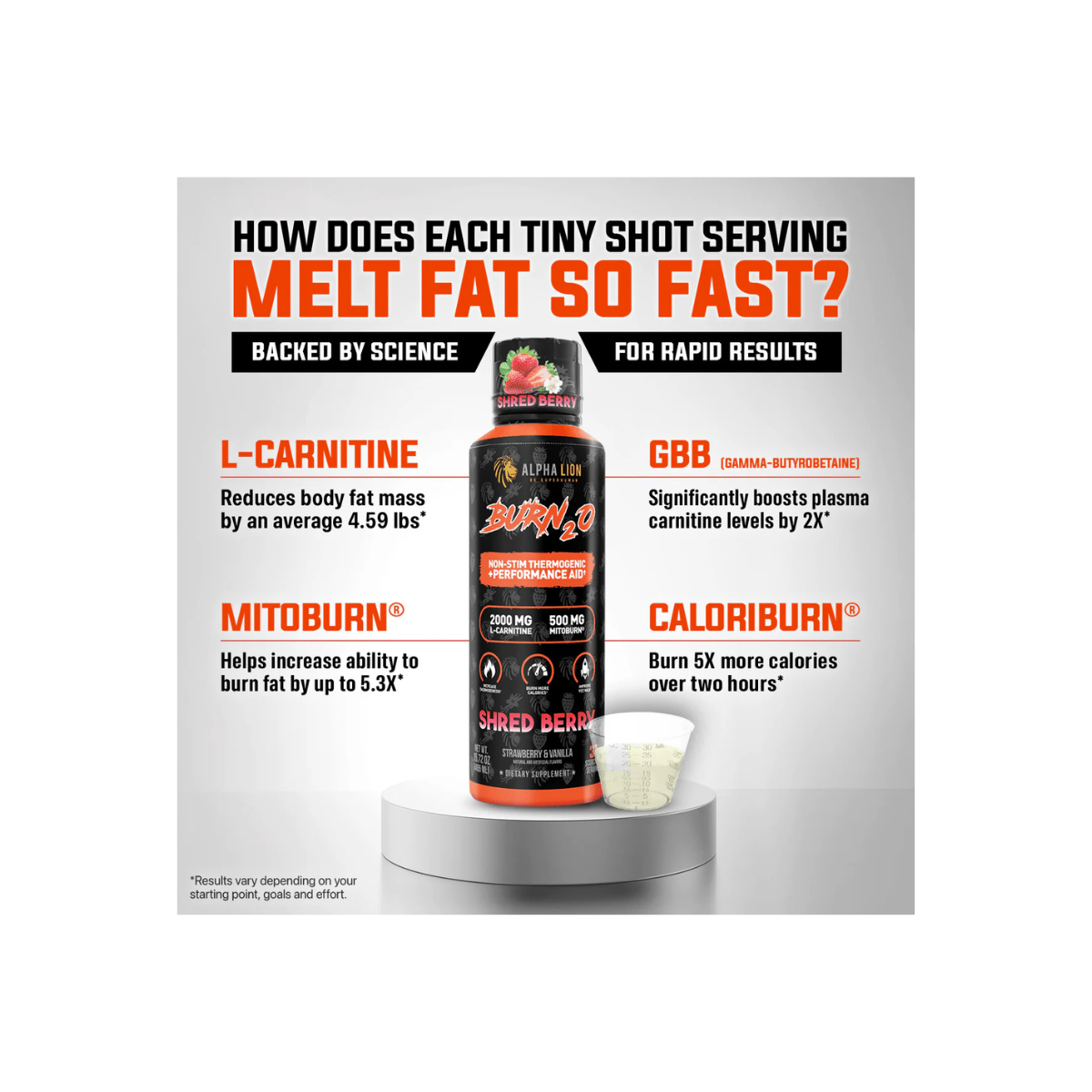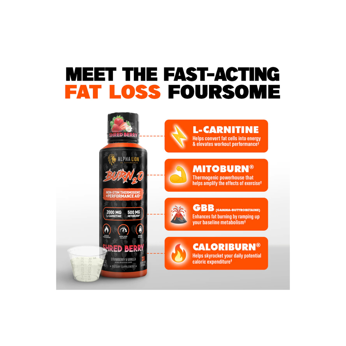 AlphaLion™ Burn2O is the world’s first and only liquid thermogenic to combine MitoBurn®, CaloriBurn®, L-Carnitine, and GBB into a delicious, zero-calorie shot. Engineered for those seeking fat-burning power without stimulants, Burn2O is a stim-free liquid thermogenic designed to increase thermogenesis, enhance VO2 max, and optimize brain function. With 31 convenient servings per bottle, it supports calorie burning, fat-to-fuel conversion, and improved athletic performance—all while boosting mental focus, without the jitters.