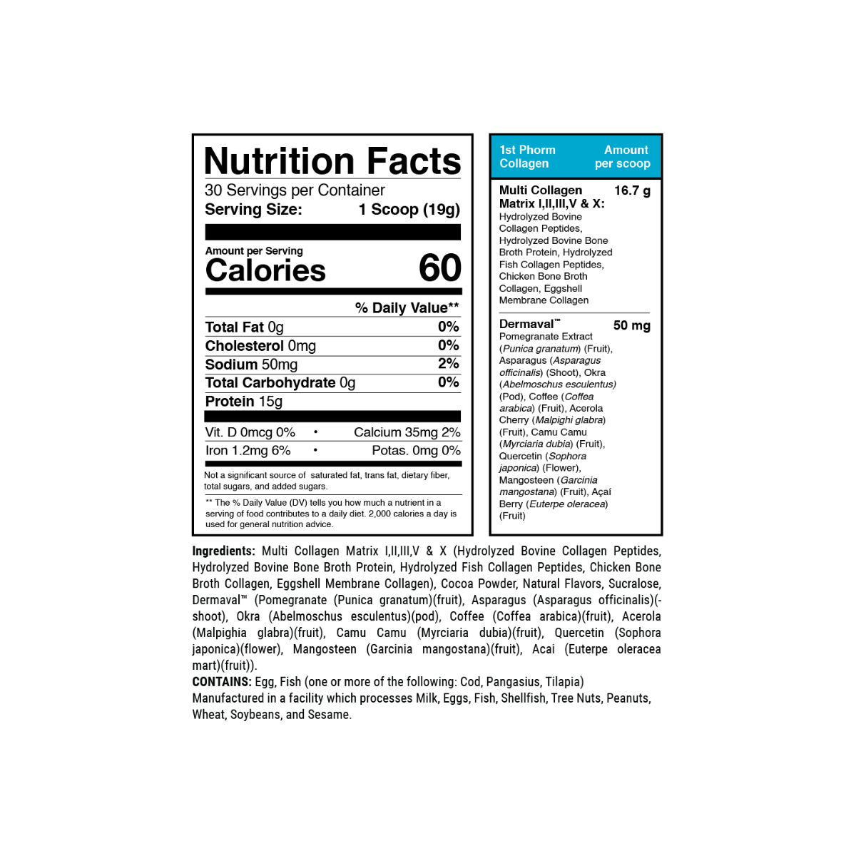 1st Phorm® Collagen with Dermaval is your daily essential for radiant skin, resilient joints, and vibrant overall wellness. Packed with 15g of hydrolyzed protein from five premium collagen sources—including bovine peptides, fish collagen, chicken bone broth, and eggshell membrane collagen—this advanced formula supports strong joints, hair, nails, and skin elasticity. Enhanced with 50mg of Dermaval, a phytonutrient-rich complex, it also helps maintain healthy elastin levels, boosting skin firmness and youthful resilience. Easy to mix into your coffee, smoothie, or water, this low-temperature processed collagen is designed for superior absorption and a smooth, delicious experience.