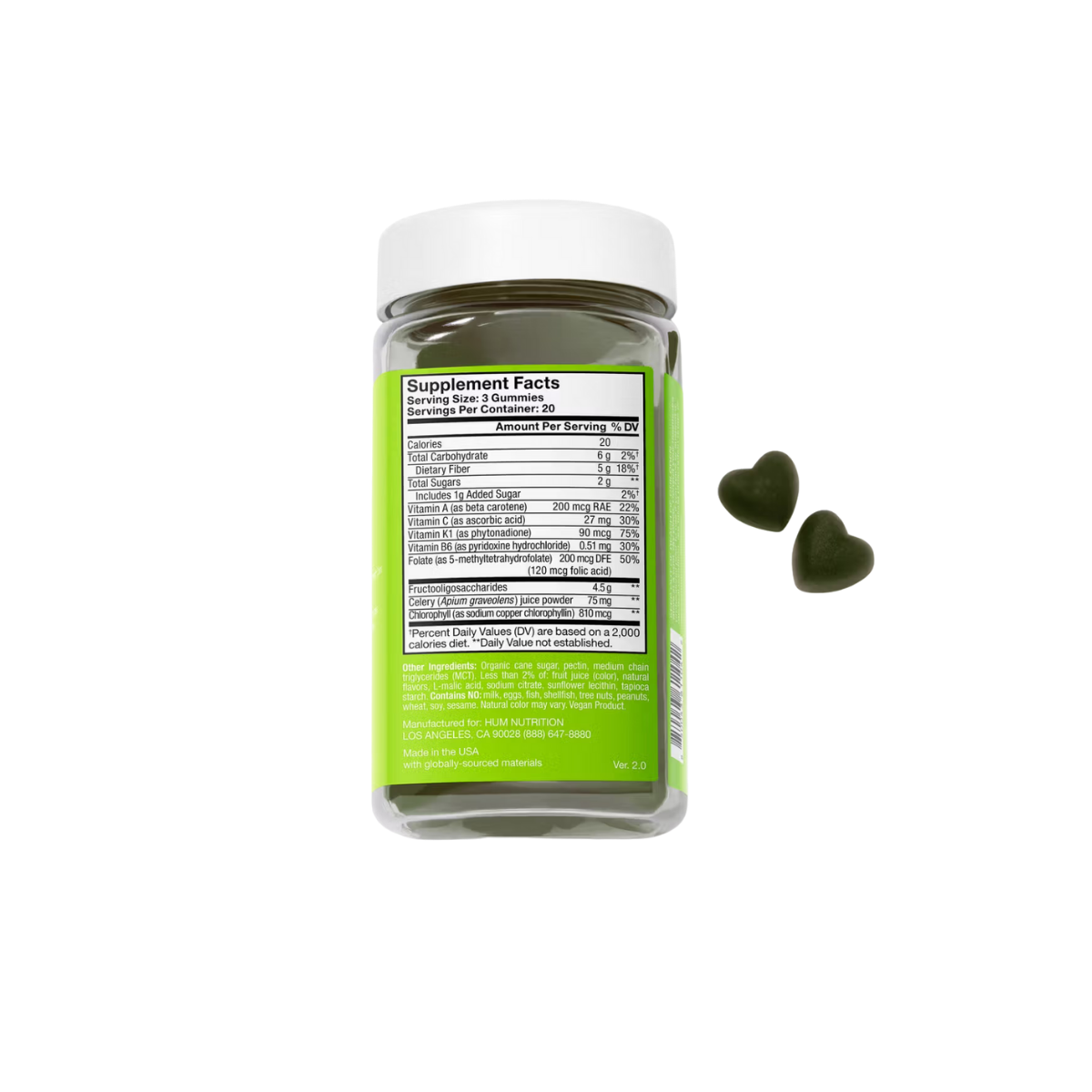 HUM NUTRITION Celery Juice Fiber Gummies offer a delicious and convenient way to support daily detoxification and digestive wellness. Powered by FOS prebiotic fiber, clinically shown to improve regularity within just 14 days**, these gummies also deliver a potent blend of chlorophyll, celery juice powder, and essential vitamins A, C, B6, K1, and Folate (B-9). This clean, plant-based formula nurtures gut health, promotes cellular detox, and boosts immune function—making it the perfect daily green addition to your routine.