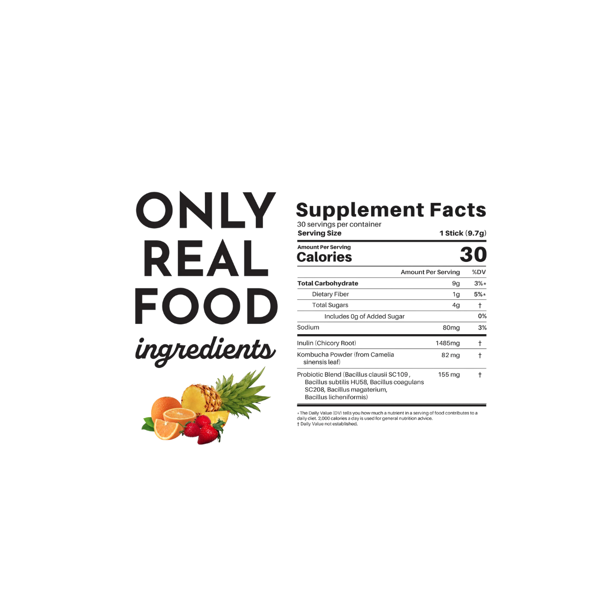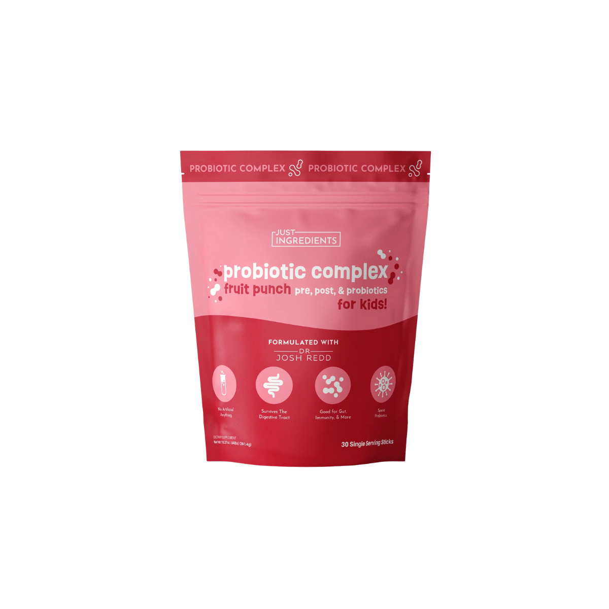 JUST INGREDIENTS® Probiotic Complex™ (KIDS) is a 3-in-1 prebiotic, probiotic, and postbiotic drink mix crafted for children ages 4 and up. Each convenient stick delivers inulin from chicory root, a light touch of kombucha powder, and a powerful 5 billion CFU probiotic blend featuring five robust Bacillus strains—including Bacillus clausii SC 109 and Bacillus subtilis HU58. Flavored naturally with strawberry, pineapple, and orange extracts, this fruity formula supports digestive balance, immune system health, and nutrient absorption—all without added sugar or artificial ingredients.