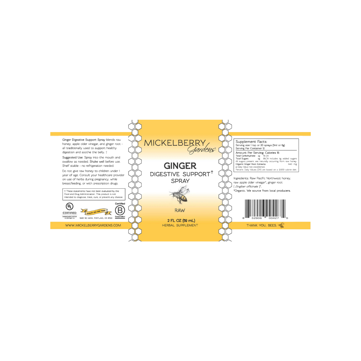 MICKELBERRY GARDENS® Ginger Digestive Support Spray is your go-to solution for calming digestion and soothing an upset stomach—anytime, anywhere. Crafted with a revitalizing blend of raw Pacific Northwest honey, raw organic apple cider vinegar, and certified organic ginger root, this thick, syrupy spray delivers a sweet, tangy burst of digestive support with every spritz. Its portable 2 oz. glass spray bottle is perfect for on-the-go relief, whether you’re at your desk, in the car, or traveling. With a naturally spicy ginger flavor and centuries-old wellness roots, this raw oxymel tonic is a modern way to keep your belly happy.