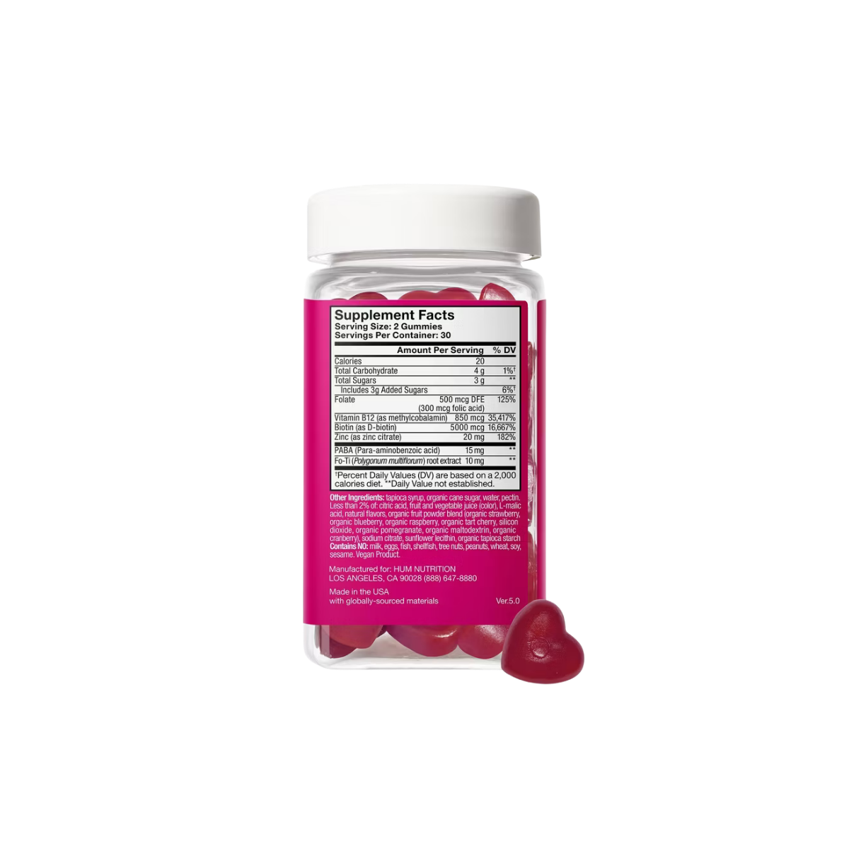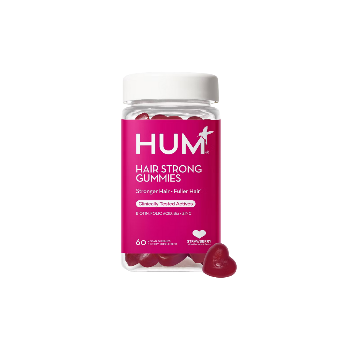 HUM NUTRITION Hair Strong Gummies deliver a clinically proven formula designed to support fuller, stronger, and healthier hair from within. Powered by biotin, folic acid, vitamin B12, and zinc, this targeted blend is supported by a double-blind, placebo-controlled clinical study in which 94% of participants reported stronger hair and 89% saw faster growthover six months. Key ingredients like Fo-Ti help maintain natural hair color, while PABA and other essential nutrients nourish hair follicles and promote visible results—no synthetic colors, artificial sweeteners, or filler ingredients.