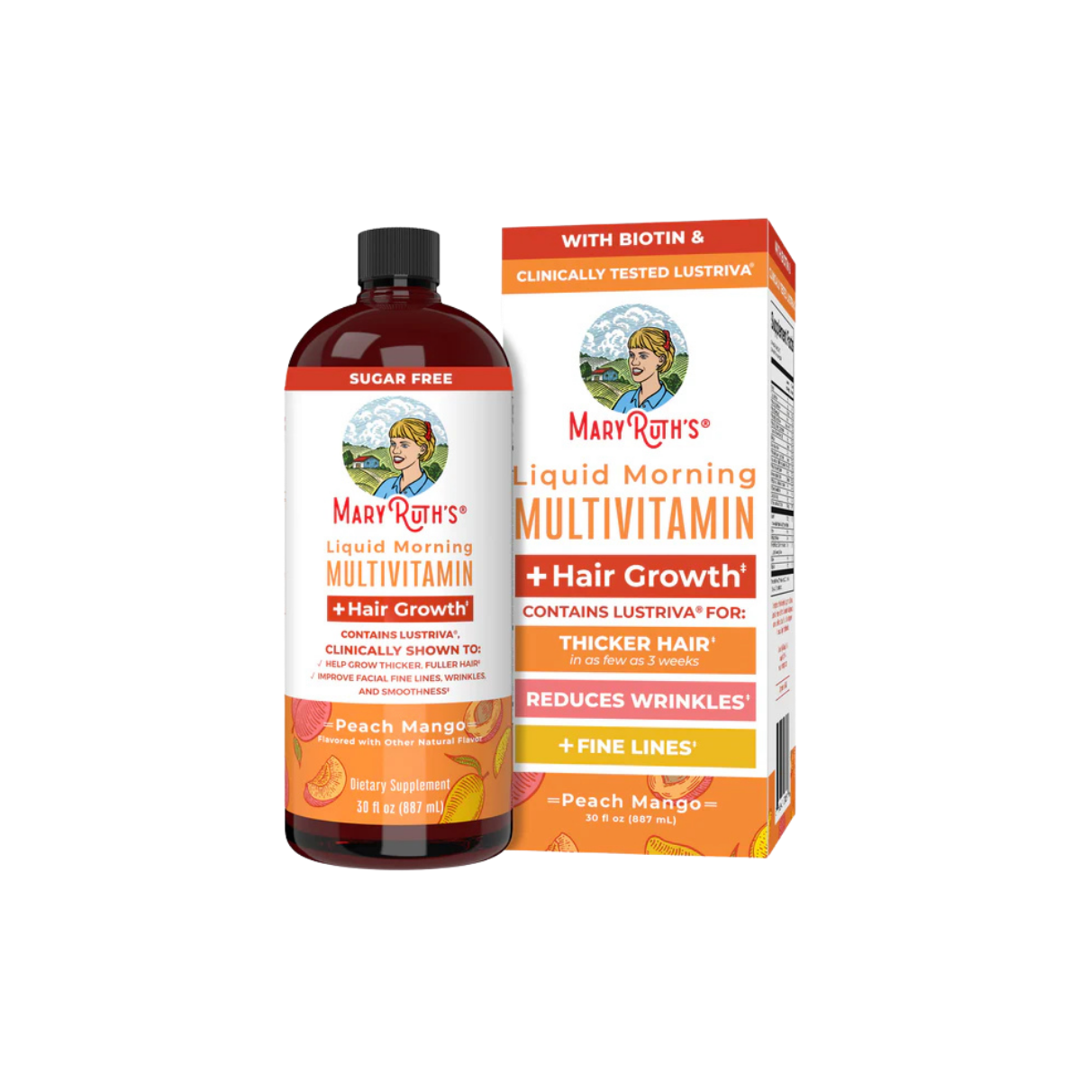 MARYRUTH’S® Liquid Morning Multivitamin + Hair Growth is a dynamic daily multivitamin formulated specifically for women seeking comprehensive wellness with added beauty benefits. Featuring clinically shown Lustriva®, this advanced formula supports thicker, fuller hair in as little as 3 weeks, while also promoting smoother skin and reducing fine lines. Each delicious peach mango-flavored dose delivers a complete spectrum of essential B vitamins, including 10,000 mcg of highly soluble biotin (magnesium biotinate) and folate as calcium L-5-methyltetrahydrofolate. With additional support from vitamins A and D3, chromium picolinate, and more, this formula fuels energy metabolism, immune health, skin vitality, bone strength, and overall well-being—all in just two tablespoons per day.