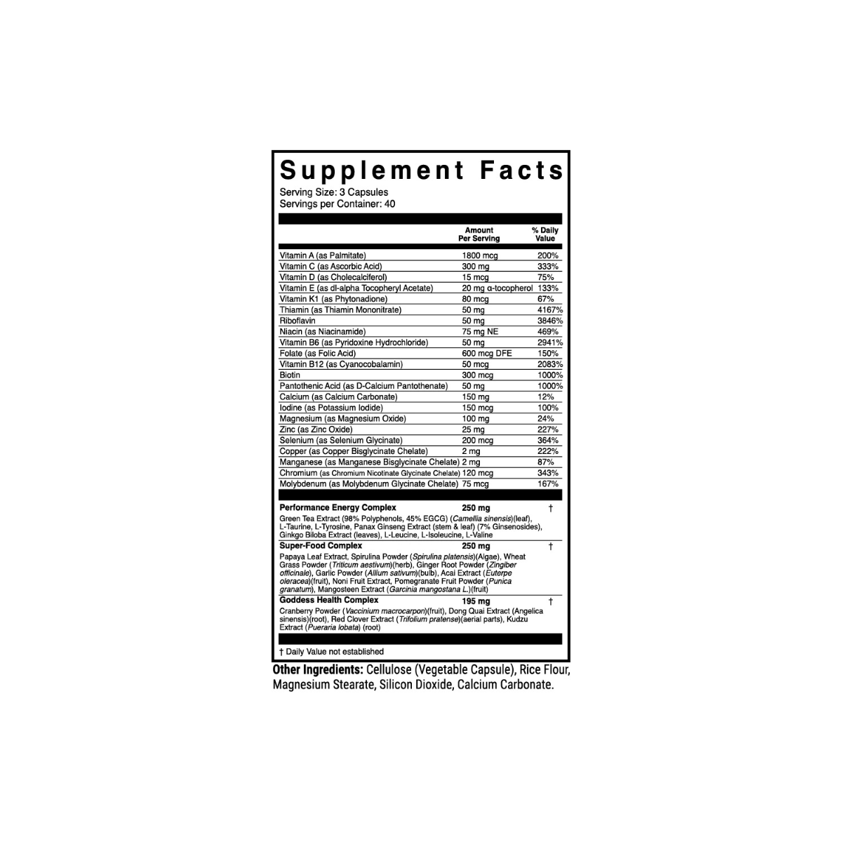 1st Phorm® M-Factor Goddess is a premium daily multivitamin crafted specifically for women seeking to elevate their wellness and performance. Packed with a comprehensive spectrum of essential vitamins and minerals, Performance Energy Complex, Super-Food Complex, and the Goddess Health Complex, this formula is designed to support macronutrient uptake, immune function, hormone balance, metabolic performance, and natural energy. The Performance Energy Complex features potent ingredients like Green Tea Extract, L-Taurine, and Panax Ginseng, delivering sustained mental clarity and vitality. Combined with superfoods like Spirulina, Papaya Leaf, and Wheat Grass, and targeted hormone-supporting nutrients, M-Factor Goddess helps you stay balanced, energized, and ready to meet your goals—whether in the gym or in daily life.