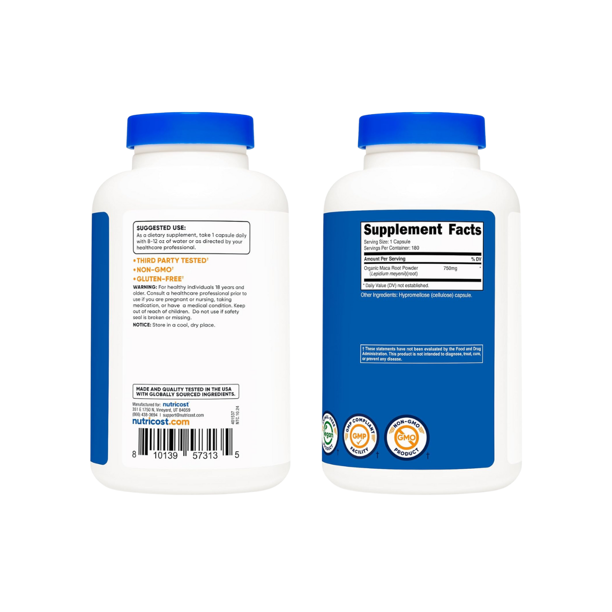 NUTRICOST® MACA ROOT delivers a pure and powerful dose of 750mg of organic Peruvian-sourced maca root per capsule, designed to support energy, stamina, and overall vitality. Each bottle provides 180 vegetarian capsules, crafted with only the highest quality ingredients to ensure consistent potency and effectiveness. Whether you’re looking to enhance endurance, balance, or general wellness, this Non-GMO and gluten-free formula provides a clean, trustworthy option.