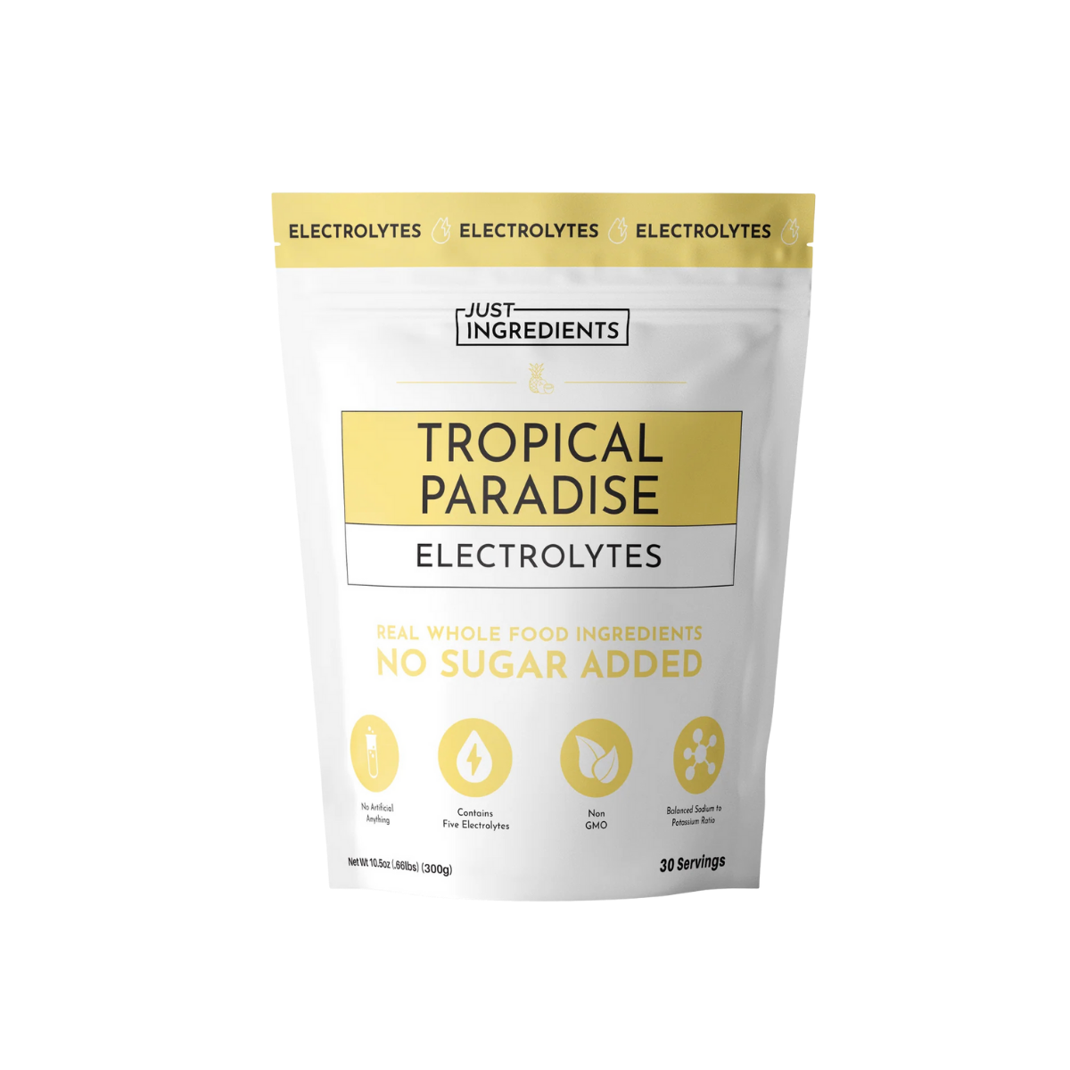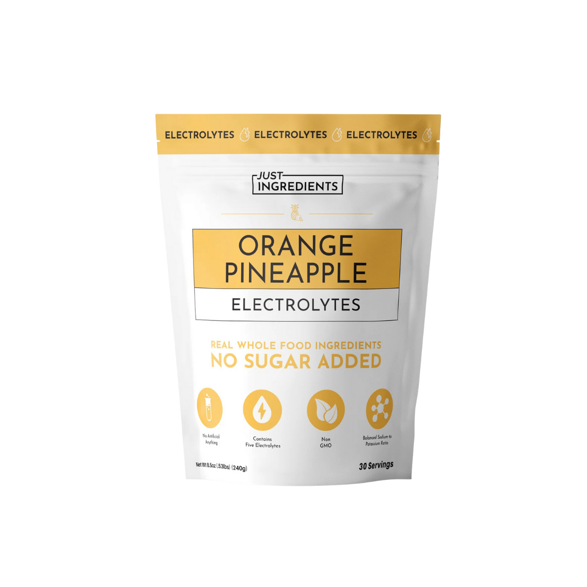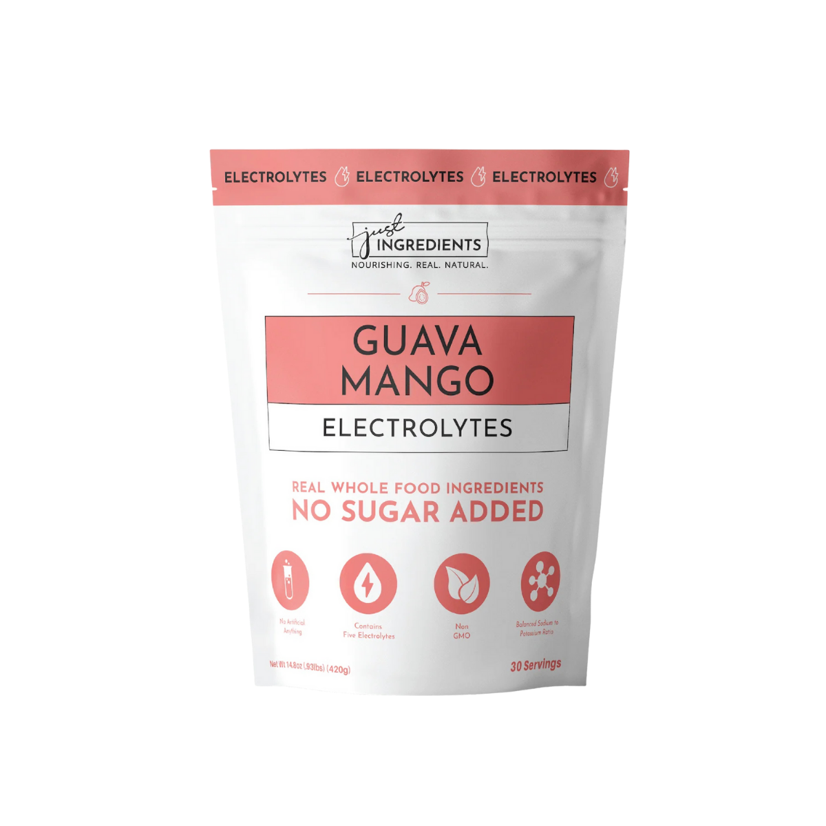 JUST INGREDIENTS® Electrolytes deliver clean, effective hydration using a powerful blend of real fruit, coconut water, and five essential electrolytes—potassium, magnesium, sodium, chloride, and calcium. With a carefully formulated 3:1 potassium-to-sodium ratio, this electrolyte mix is designed to support optimal hydration, muscle function, and nervous system performance. Free from added sugars and artificial sweeteners, and naturally sweetened with stevia leaf and monk fruit, each serving offers a refreshing taste with zero compromise. Whether you’re recovering from a workout or staying hydrated throughout your day, Just Ingredients Electrolytes are your clean, daily hydration solution.