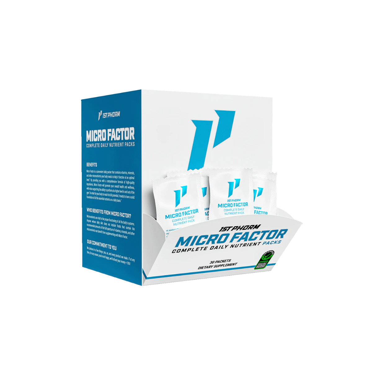 1st Phorm® Micro Factor is the ultimate all-in-one daily nutrient pack for those serious about whole-body health. Each convenient packet combines 6 powerful supplements—a complete multivitamin, robust antioxidant blend, 8 billion CFU probiotic, omega-3 essential fatty acids, CoQ10, and a potent fruits & veggies superfood complex—to support immune function, natural energy, metabolism, gut health, cardiovascular health, and cellular detox. Whether you’re filling gaps in your diet or optimizing your wellness routine, Micro Factor delivers comprehensive support in one easy step.