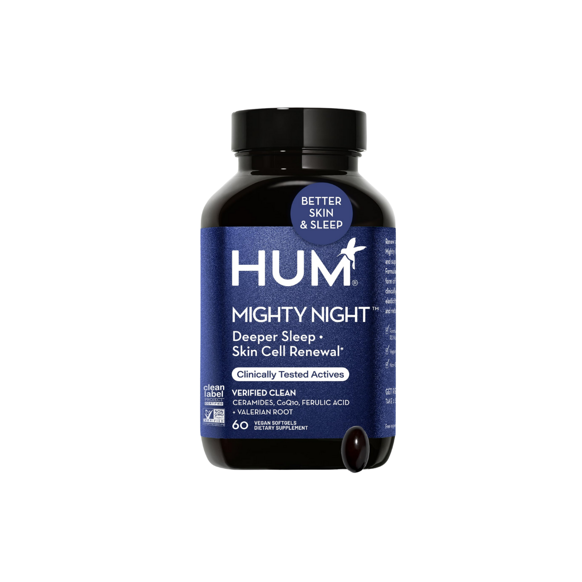 HUM NUTRITION Mighty Night™ is your ultimate nighttime beauty supplement, clinically formulated to support glowing skin and deep, restorative sleep. Each serving delivers a targeted blend of ceramides to help lock in moisture and improve skin texture, alongside ferulic acid and CoQ10—two powerhouse antioxidants that defend against free radicals and early signs of aging. To promote restful sleep, MIGHTY NIGHT™ includes valerian root, passion flower, and hops, traditionally used to encourage deeper, more peaceful sleep. In a clinical study, 96% of participants reported improved sleep quality and 86% noticed brighter skin—all within 60 days.