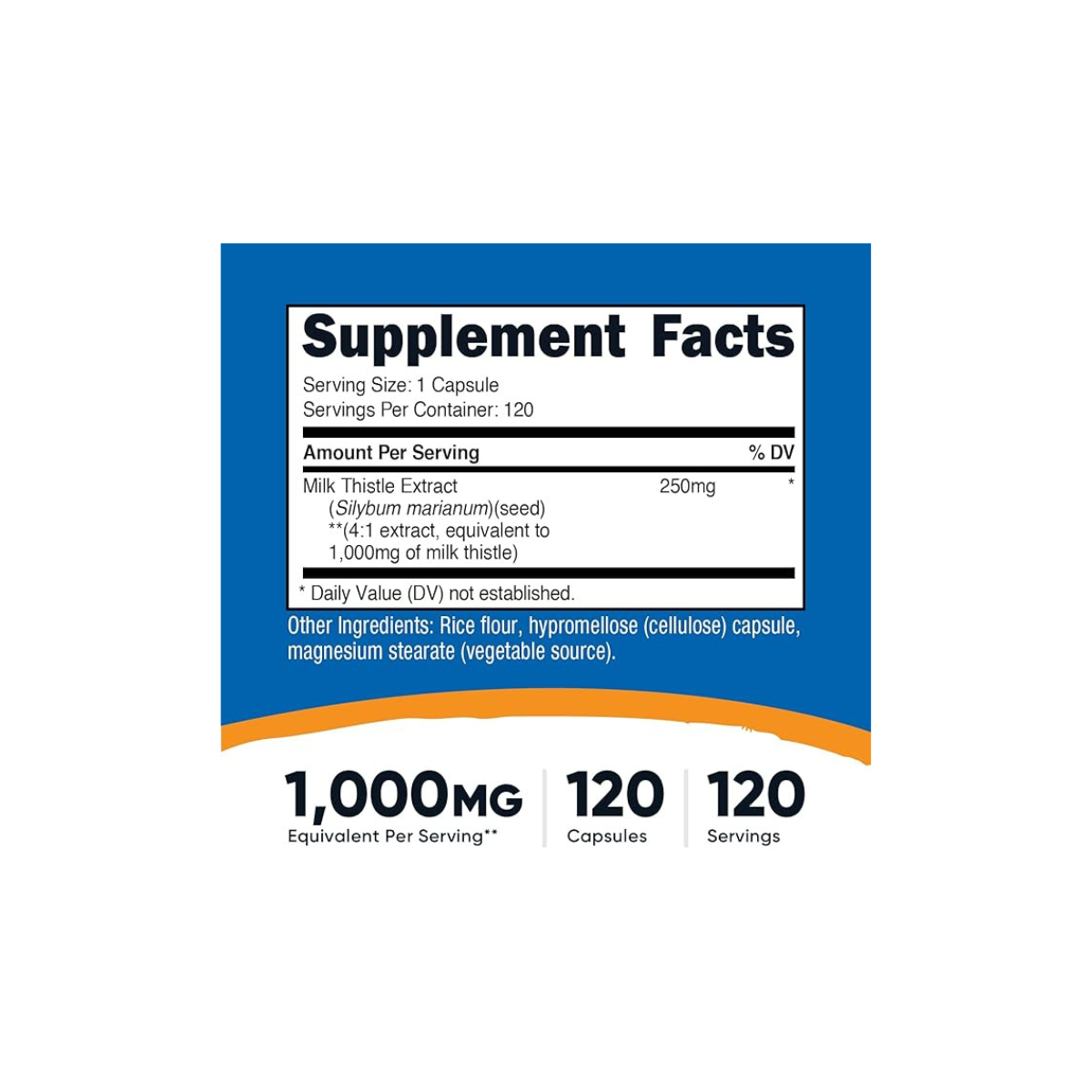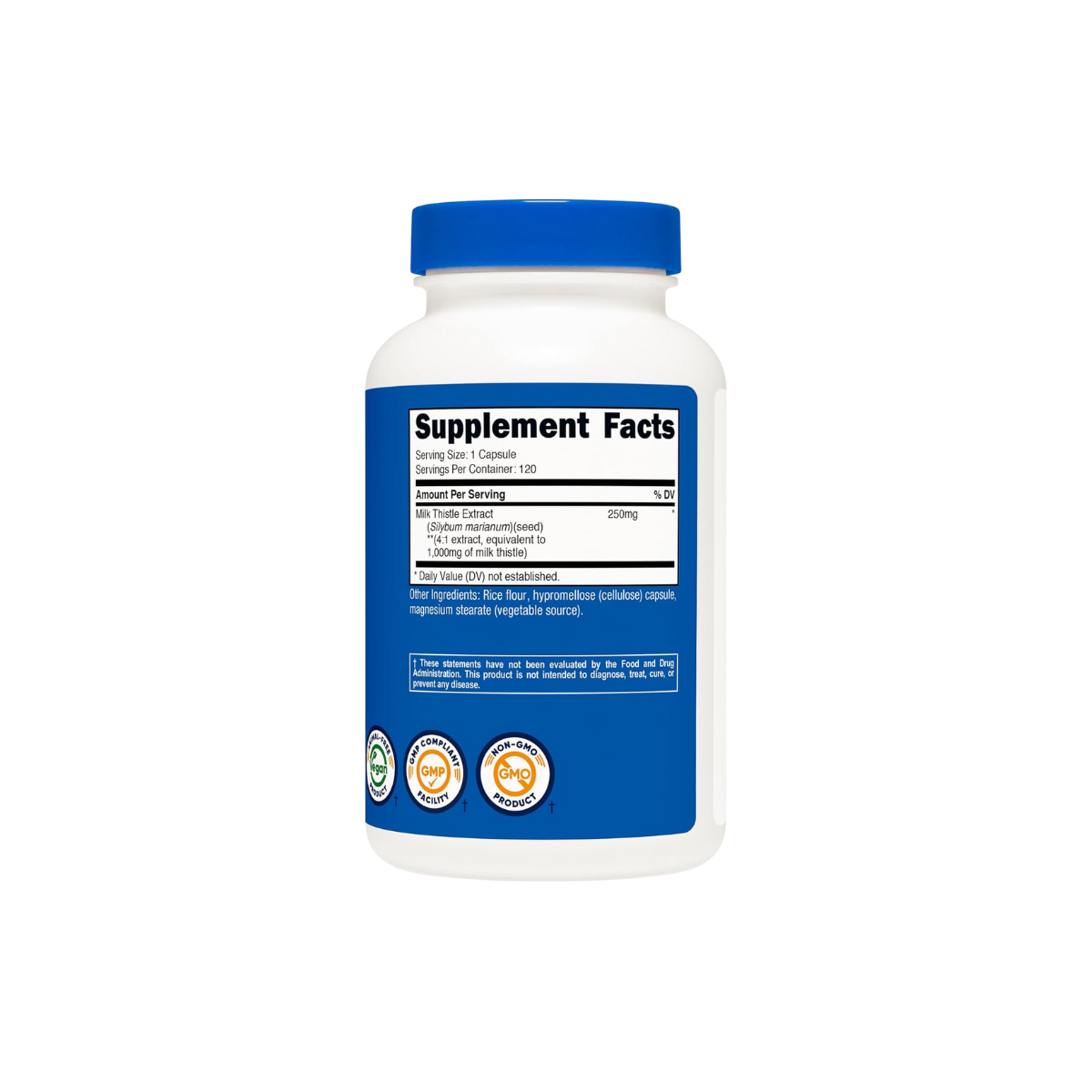 NUTRICOST® MILK THISTLE delivers premium-grade liver support with a potent 4:1 milk thistle extract. Each 250mg vegetarian capsule provides the equivalent of 1,000mg of raw milk thistle, giving you concentrated strength in every serving. This supplement is designed for consistency, purity, and long-term wellness. Non-GMO, gluten-free, and vegetarian-friendly, Nutricost ensures you get only high-quality ingredients produced in an FDA-registered, GMP-compliant facility.