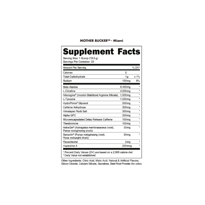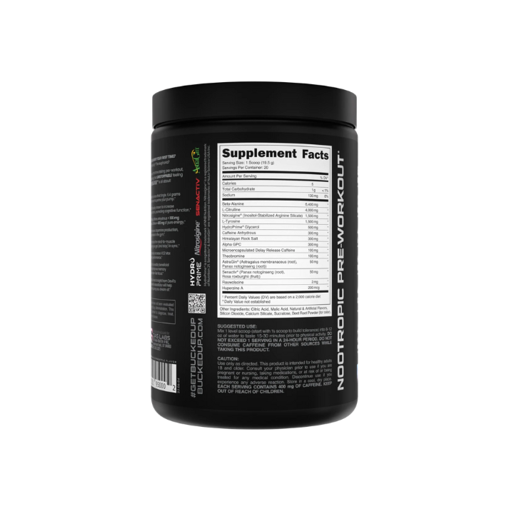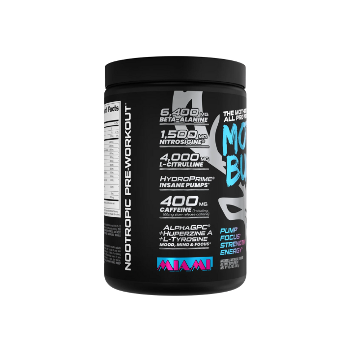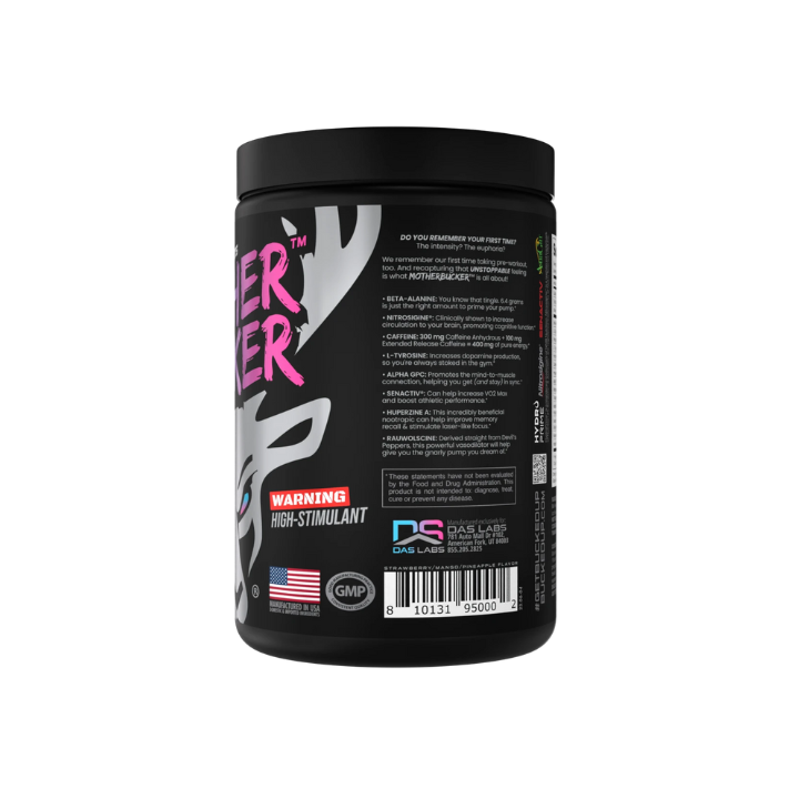 BUCKED UP® Mother Bucker™ is the ultimate pre-workout for elite athletes and seasoned fitness enthusiasts seeking unparalleled intensity. Formulated with a potent blend of 400mg of caffeine, including 100mg of slow-release caffeine, 6,400mg of beta-alanine, 4,000mg of L-citrulline, and 1,500mg of Nitrosigine®, this pre-workout delivers sustained energy, enhanced endurance, and superior pumps to help you dominate your workouts.