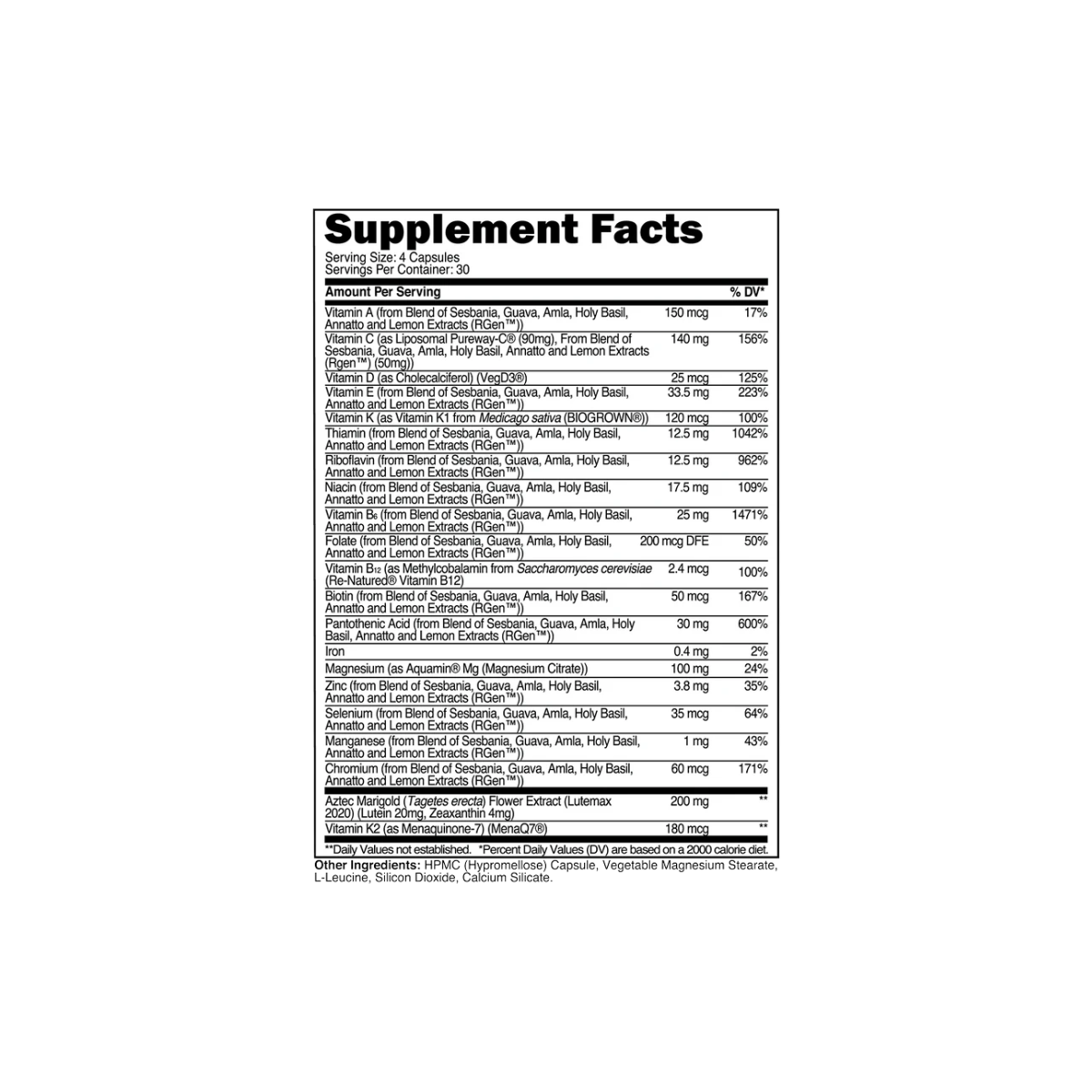 TRANSPARENT LABS® Multivitamin is a premium, whole-food-based multivitamin designed for health-conscious individuals seeking all-in-one daily nutritional support. Packed with bioavailable, plant-based vitamins and minerals, including Vitamin A from beta-carotene, 140mg of dual-source Vitamin C (Liposomal Pureway-C® and RGen™), and 1,000 IU of vegan-certified D3 (VegD3®), this formula ensures optimized absorption and effective daily wellness support. Enhanced with LuteMax 20/20® (20mg lutein and 4mg zeaxanthin) for advanced eye and vision protection, and fortified with vitamins K1, K2, and E, it promotes immune balance, cardiovascular function, bone health, and cellular integrity. Free from artificial sweeteners, colors, and preservatives, this vegan-friendly, non-GMO, and gluten-free multivitamin delivers clean, science-backed nutrition you can trust.