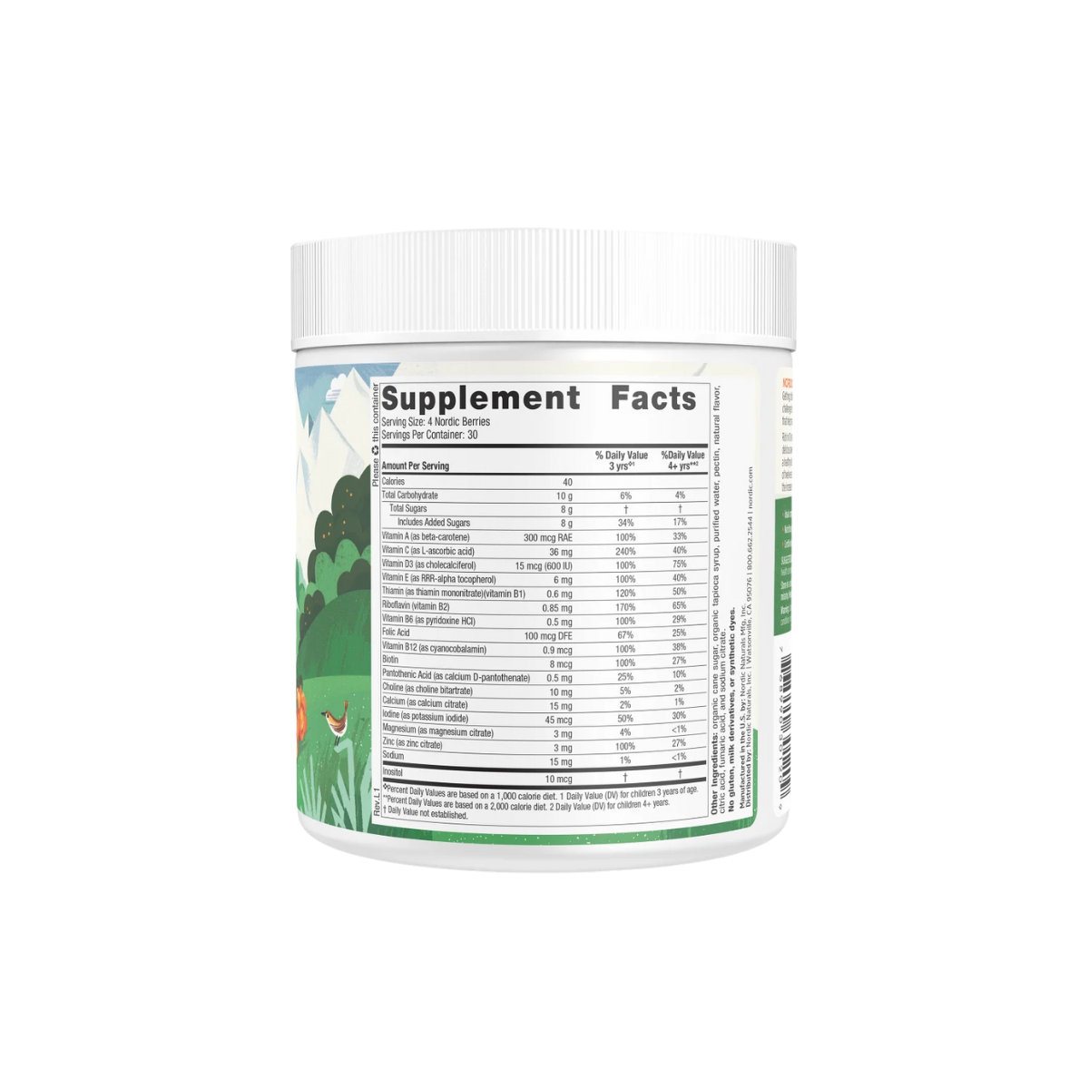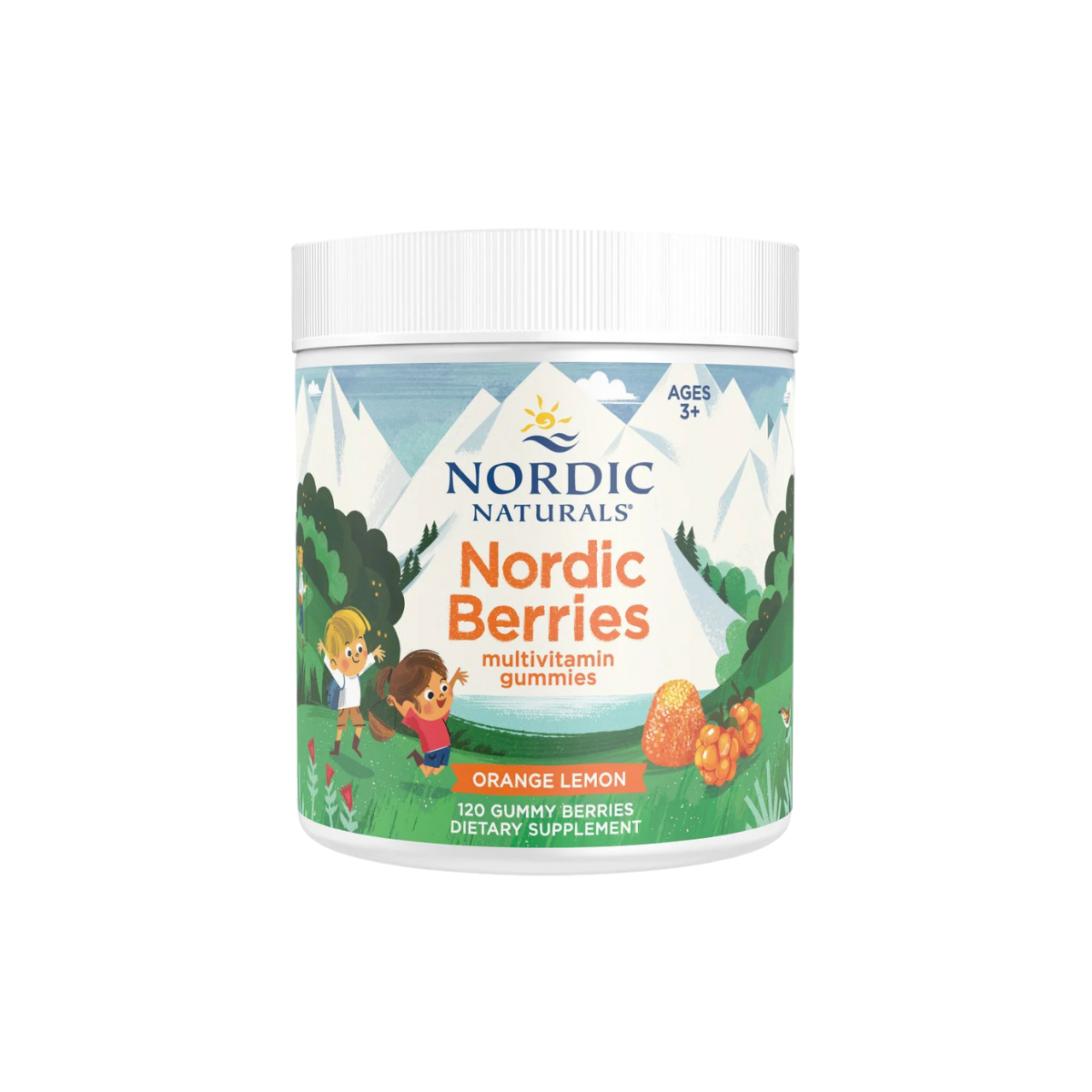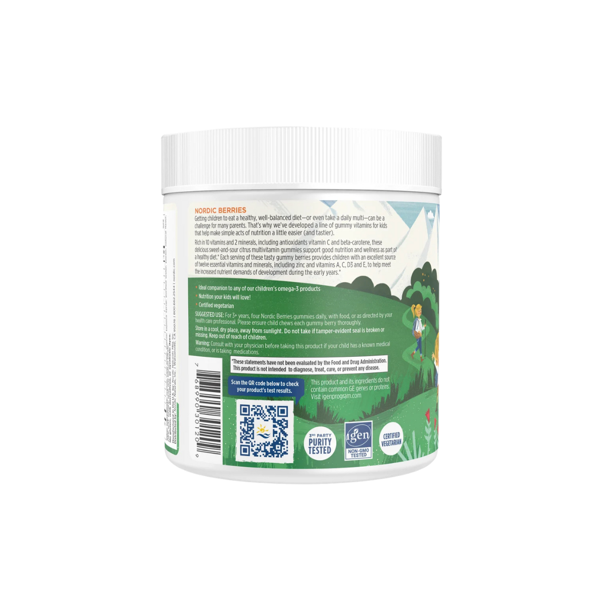 NORDIC NATURALS® Nordic Berries Multivitamin makes daily nutrition delicious and easy for kids and adults alike. This pectin-based, chewable gummy is specially formulated for ages 3 and up, delivering essential nutrients including vitamins A, B, C, D3, E, and zinc to support optimal wellness.* With no artificial coloring, flavoring, or preservatives, and a gluten-free, dairy-free, and gelatin-free formula, Nordic Berries® is a trusted choice for families who prioritize clean nutrition. Its award-winning taste and vegetarian ingredients make it a daily treat you can feel good about.