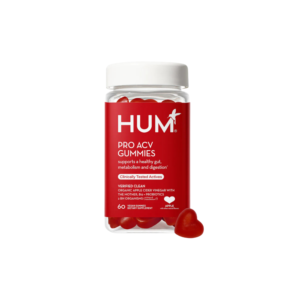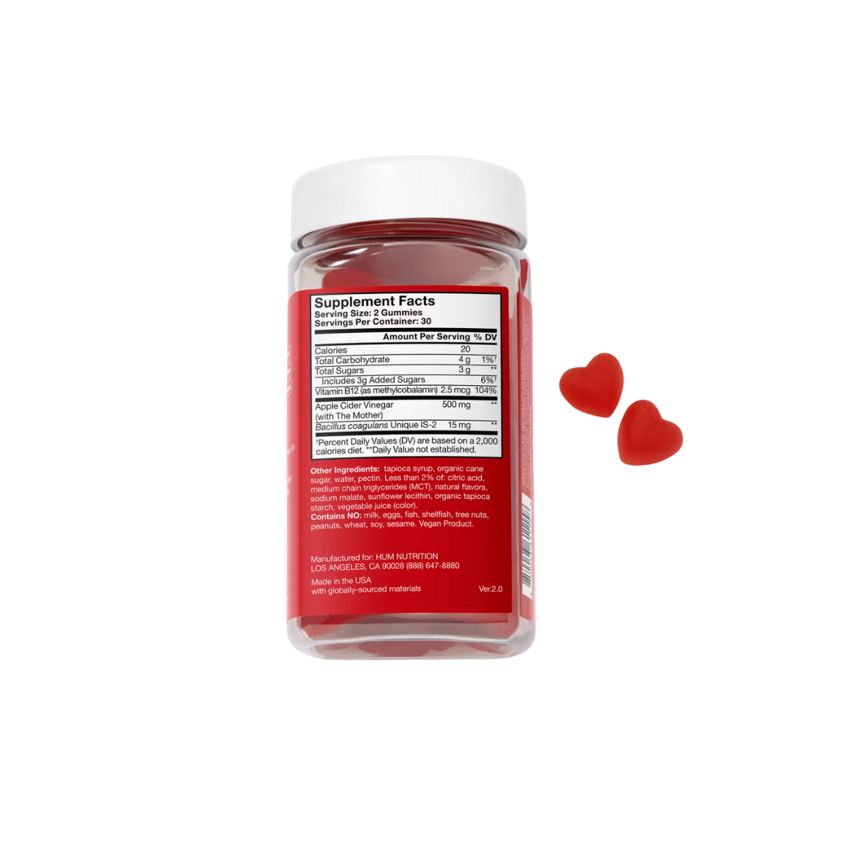 HUM NUTRITION PRO ACV Gummies deliver a powerful daily boost for digestion, gut health, and metabolism—all in a convenient, vegan-friendly gummy. Each serving combines 100% organic apple cider vinegar with The Mother (culture of beneficial bacteria that turns apple cider into vinegar) clinically tested probiotics (2 billion CFU of B. coagulans Unique IS2), and vitamin B12 to help support digestive regularity, promote a balanced gut microbiome, and fuel cellular energy production. In a double-blind, placebo-controlled study, 98% of participants achieved digestive regularity with this probiotic strain. Made without artificial additives or sweeteners, PRO ACV GUMMIES offer a clean, effective, and delicious way to support your wellness routine.
