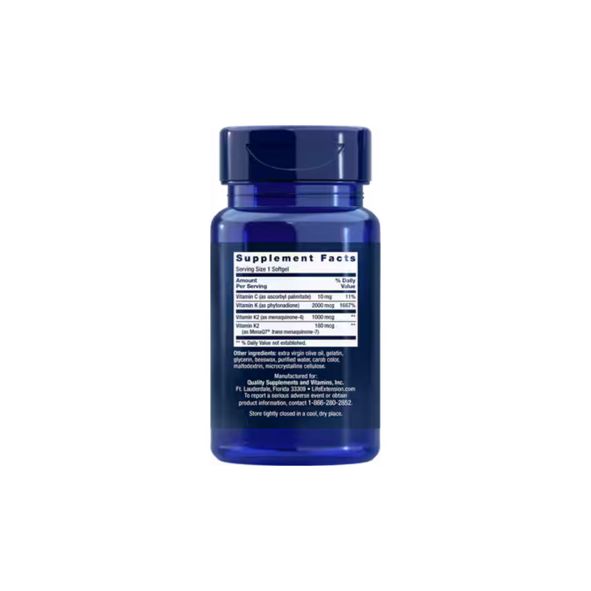LIFE EXTENSION® Super K delivers a powerful daily dose of 2,000 mcg of vitamin K, combining vitamin K1with two highly bioavailable forms of vitamin K2 — menaquinone-4 (MK-4) and menaquinone-7 (MK-7) — to support heart health, arterial function, and bone strength. This advanced formula promotes healthy calcium balance, directing calcium into your bones while helping maintain flexible, healthy arteries. With just one softgel a day, you get clinically supported amounts of this essential nutrient that’s difficult to obtain through diet alone.