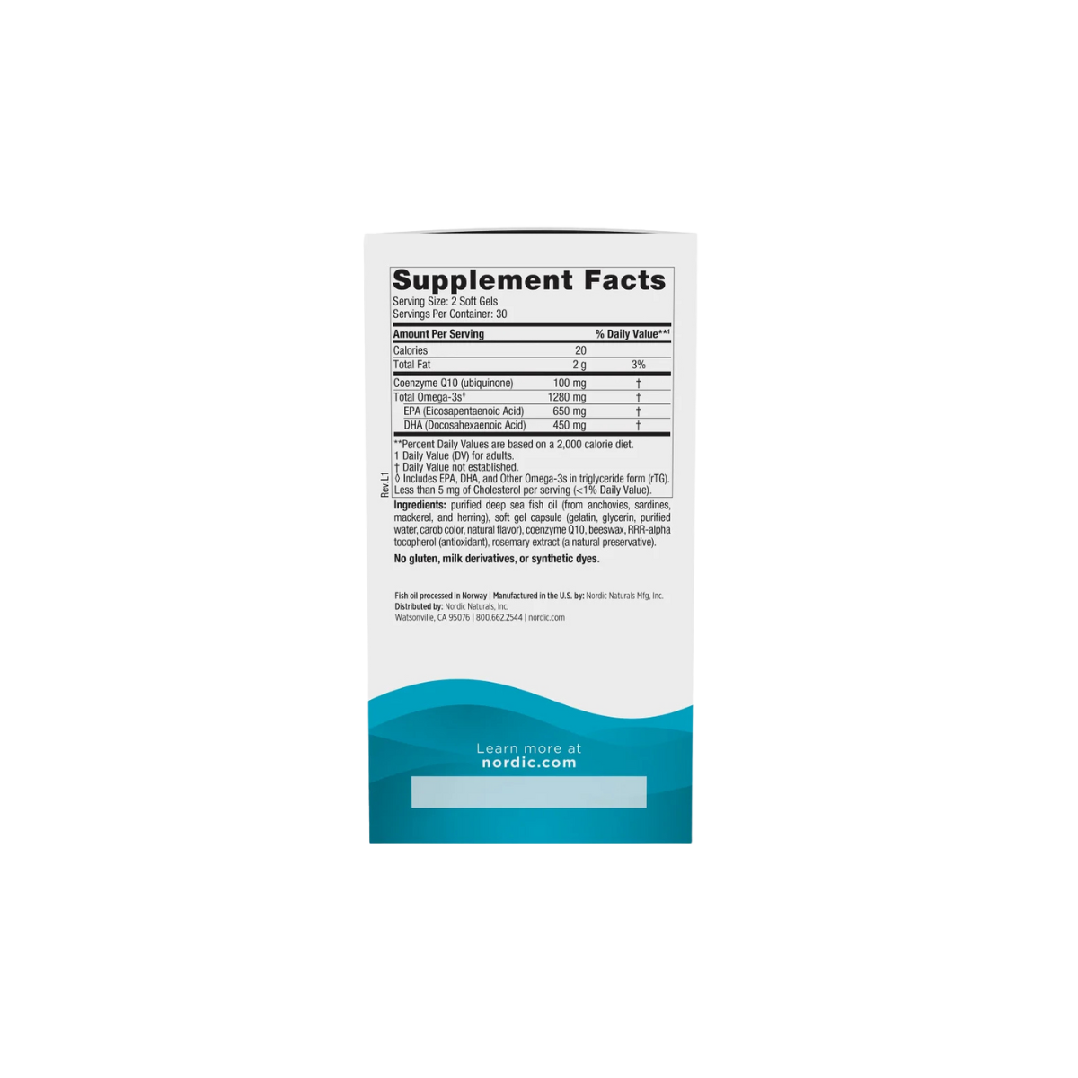 NORDIC NATURALS® Ultimate Omega +CoQ10 is a powerhouse heart-support supplement combining 1,280mg of total omega-3s with 100mg of CoQ10 (ubiquinone) in each serving. Featuring the trusted, high-potency Ultimate Omega® fish oil formula alongside CoQ10, this unique blend supports cardiovascular health, cellular energy production, and antioxidant defense—especially crucial as natural CoQ10 levels decline with age. Crafted from wild-caught, sustainably sourced fish and optimized for superior absorption, Ultimate Omega® +CoQ10 is an ideal daily solution for those looking to maintain heart and cellular vitality.