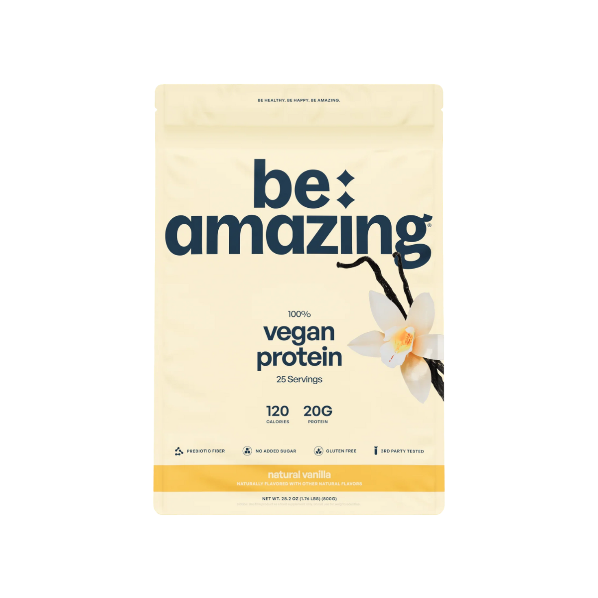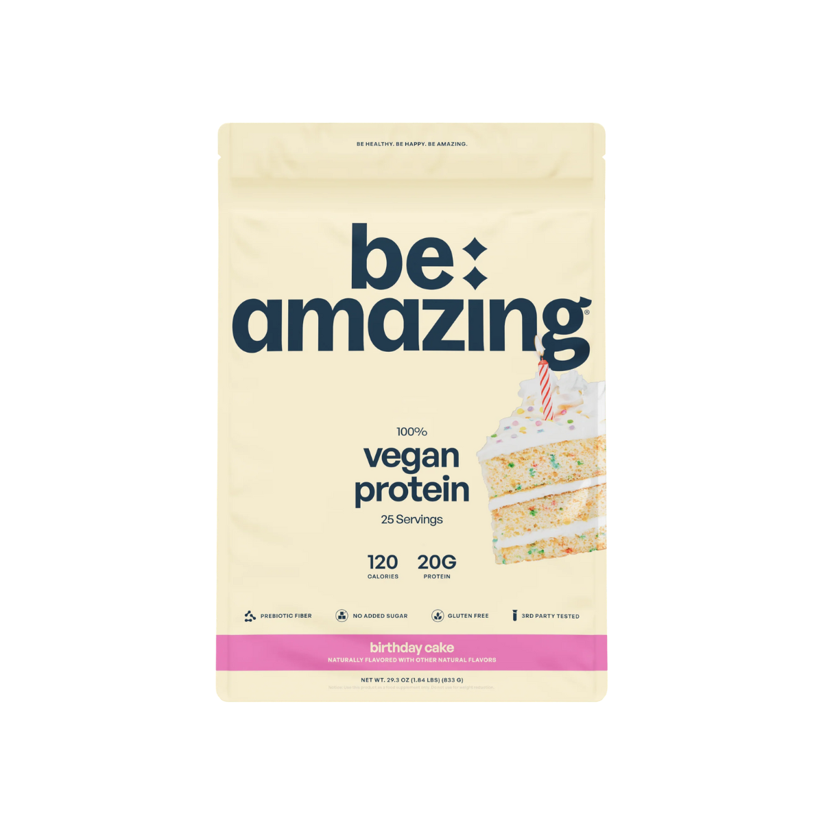 BE AMAZING Vegan Protein Powder delivers clean, plant-based power in every scoop, making it the perfect choice for anyone looking to build lean muscle while supporting gut health. Each serving provides 21g of protein with just 100 calories, enhanced by digestive enzymes and prebiotic fiber for optimized digestion. Infused with essential nutrients like vitamin D, iron, calcium, and potassium, this smooth, Birthday Cake-flavored shake is gluten-free, soy-free, sugar-free, and low in carbs—ideal for a post-workout refuel or a tasty anytime boost.