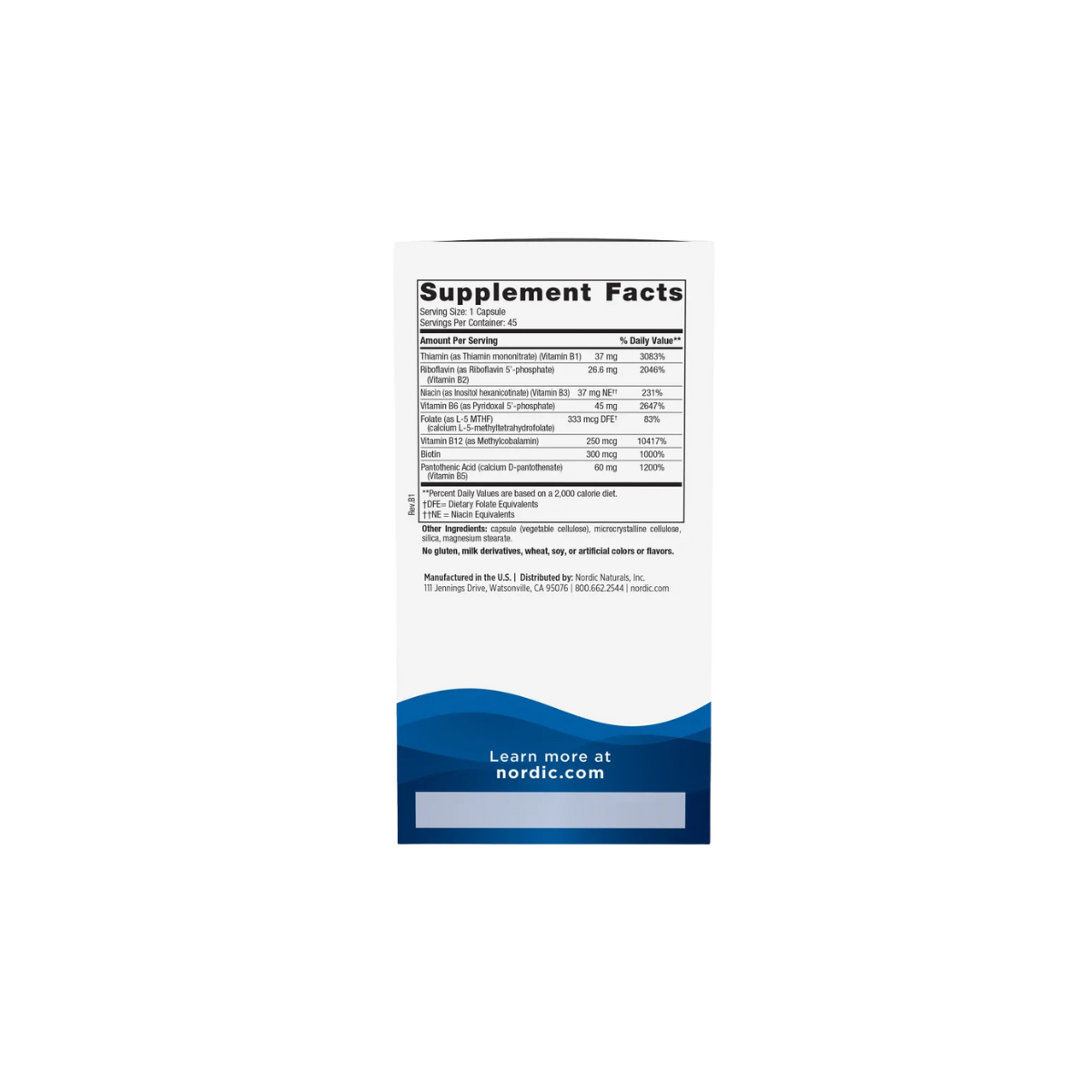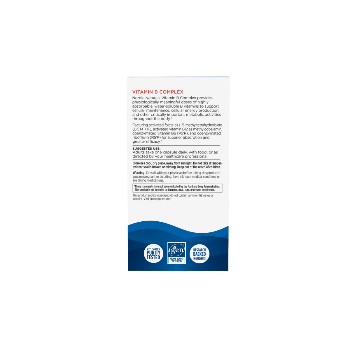 NORDIC NATURALS Vitamin B Complex is a premium daily formula designed to support optimal cellular metabolism and energy production. With a synergistic blend of all eight essential B vitamins in their most bioavailable forms—including methylfolate (MTHF) and methylcobalamin (B12)—this once-daily capsule ensures efficient nutrient absorption and utilization. Enhanced with P5’P (active B6) and R5’P (active riboflavin), it helps fuel critical enzymatic reactions throughout the body, making it a reliable foundation for sustained vitality and well-being.