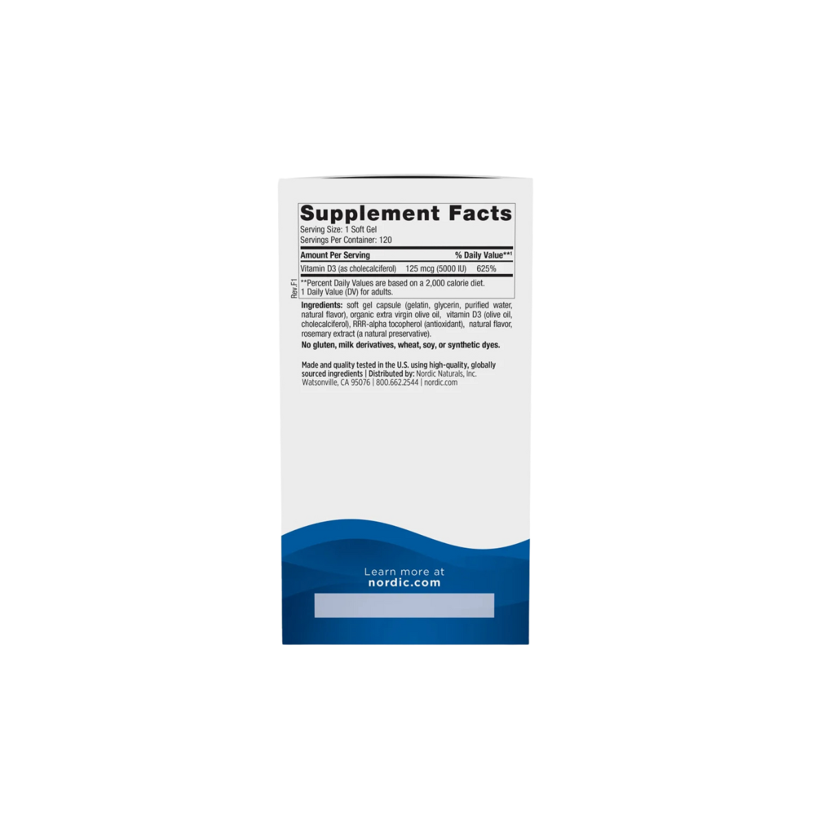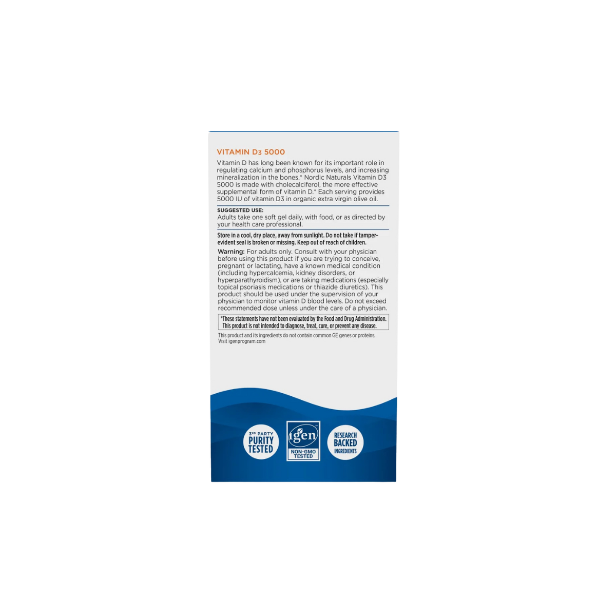 NORDIC NATURALS® Vitamin D3 5000 delivers a powerful dose of 125 mcg (5000 IU) of natural vitamin D3 in a convenient, easy-to-swallow mini soft gel. Designed for adults with limited sun exposure or clinically confirmed vitamin D deficiency, this essential supplement supports strong bones, positive mood, and robust immune function to help you feel your best every day.