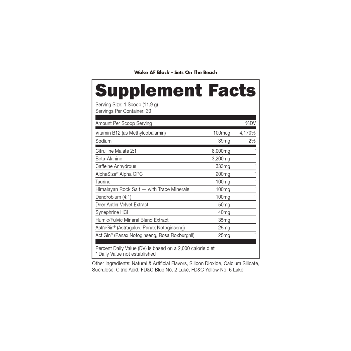 BUCKED UP® Woke AF Black™ is the hardcore pre-workout formula built for seasoned stim-heads who demand extreme energy, laser focus, and next-level performance. Powered by a potent 333mg of caffeine anhydrous, 300mg of Theobromine, and the dual thermogenic punch of Synephrine HCI and Dendrobium, this elite blend energizes like no other. Backed by 6,000mg of Citrulline Malate for insane pumps, 3,200mg of Beta-Alanine for muscular endurance, and 200mg of AlphaSize® Alpha GPC for cognitive clarity, WOKE AF BLACK™ turns up every facet of your workout. Added Humic/Fulvic Acid, Taurine, and Himalayan Rock Salt support detox, hydration, and absorption—fueling you long after your session ends.